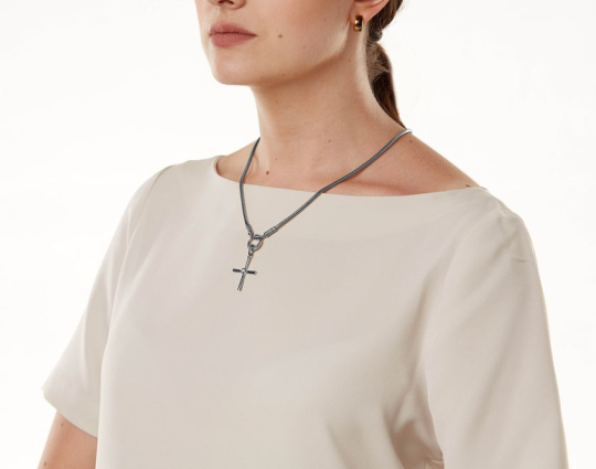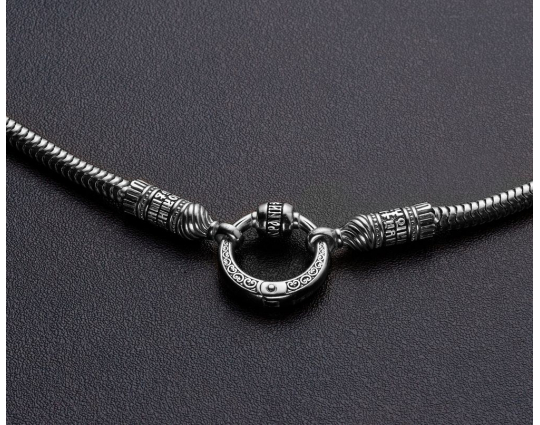 На концах - специальные серебряные зажимы в форме куполов. На них написаны слова – обращения к Богу. Замком служит съемное кольцо- переходник с узором. Это византийский орнамент -символ чистоты и верности.