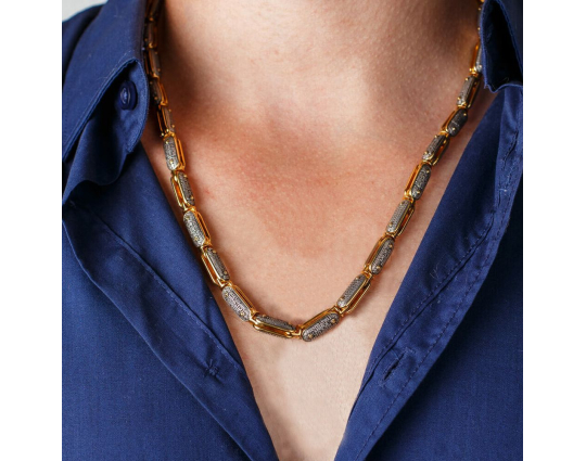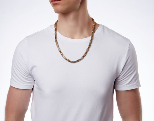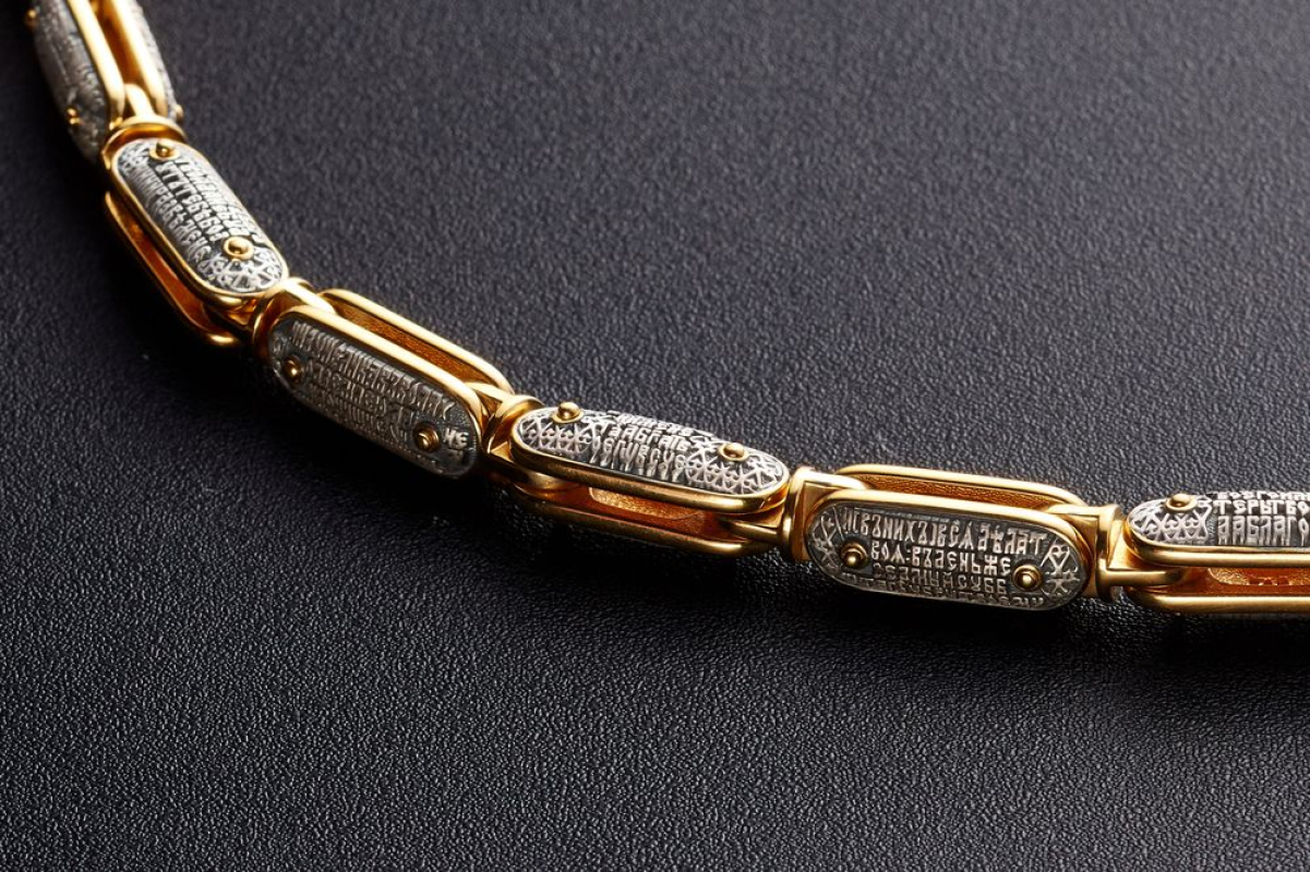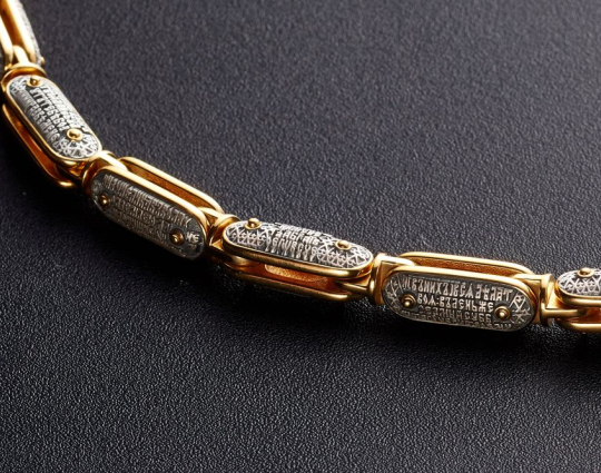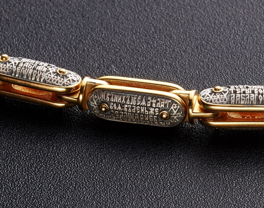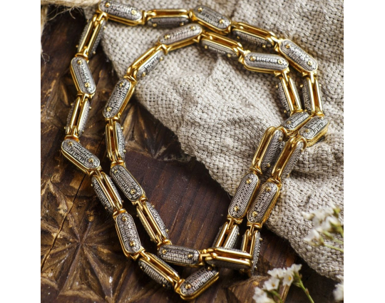 Массивная серебряная цепь с позолоченными элементами. На каждом звене цепи - орнамент и слова одной из десяти Заповедей Божьих, которые чтят все верующие и последователи Иисуса Христа.