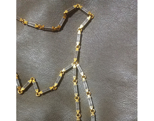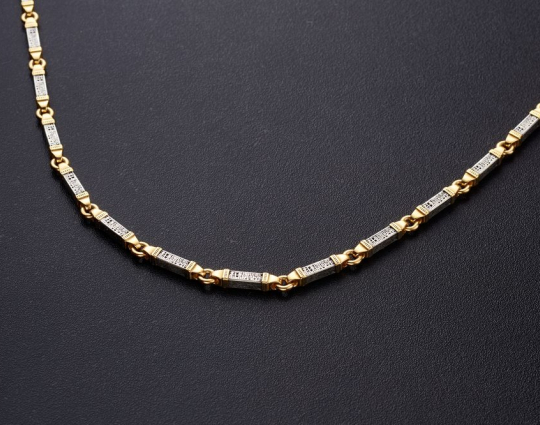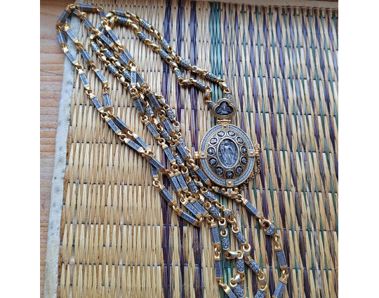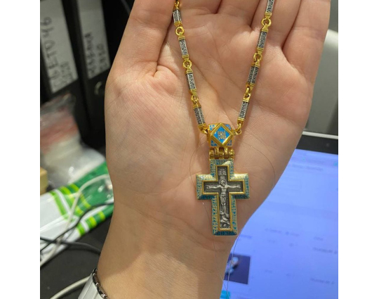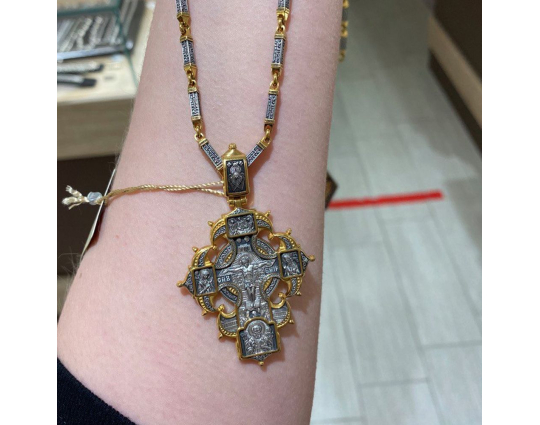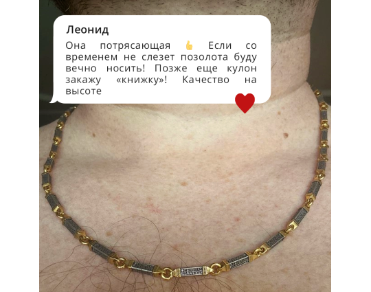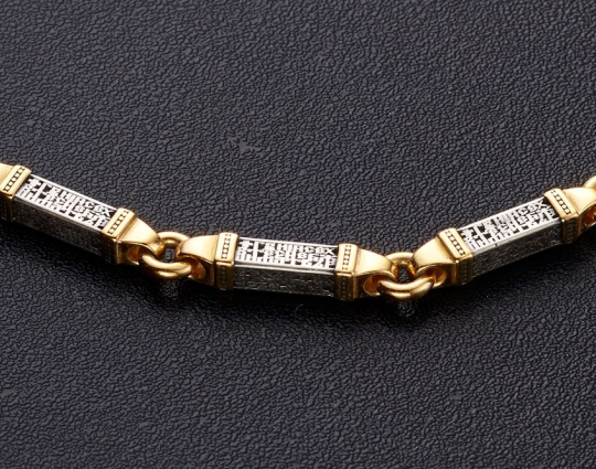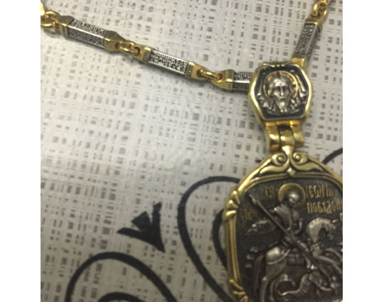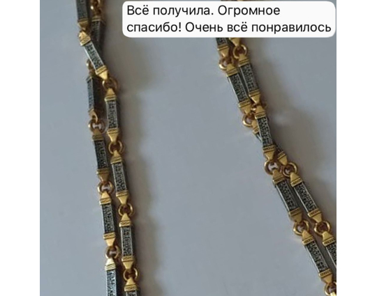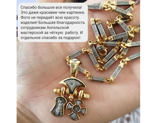 Серебряная цепь с позолоченной отделкой, состоящая из объемных звеньев геометрической формы. На каждом из них написана «Предначинательная молитва», которую можно читать как защитную в сложных и опасных ситуациях, так и помогающую в любых делах.