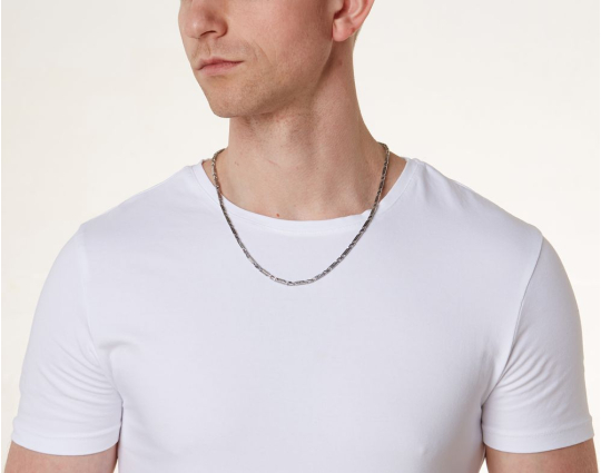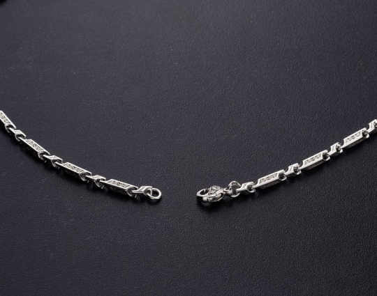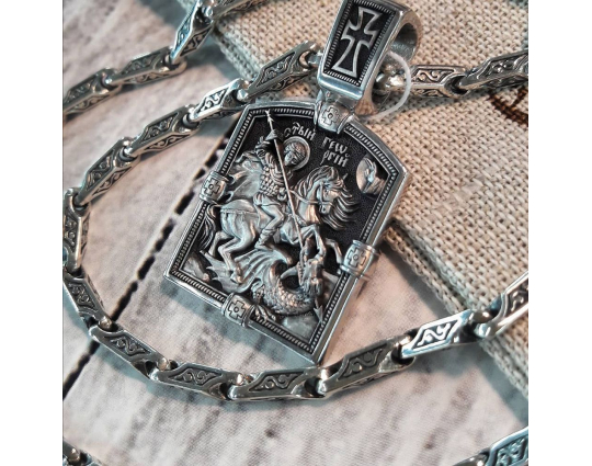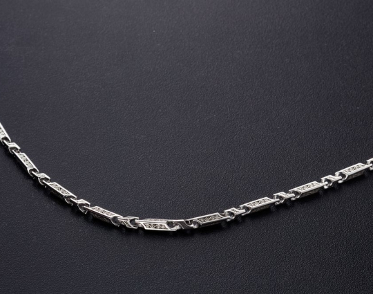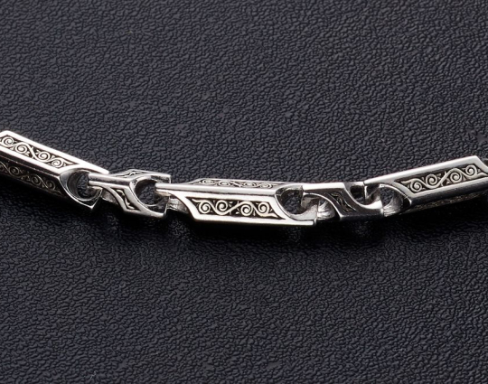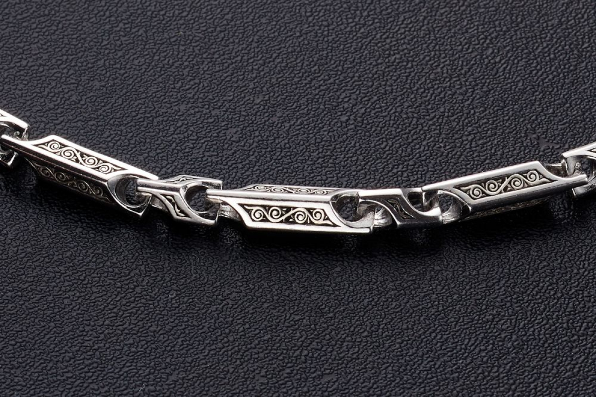 Серебряная  цепь с родиевым покрытием, которое защищает изделие от почернения и агрессивного воздействия внешней среды. Цепь состоит из литых звеньев геометрической формы. На них, на искусственно затемненный  фон, нанесен изящный византийский орнамент.
