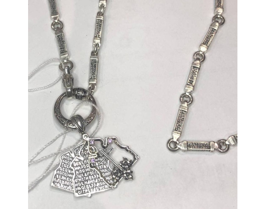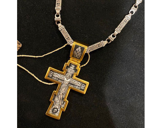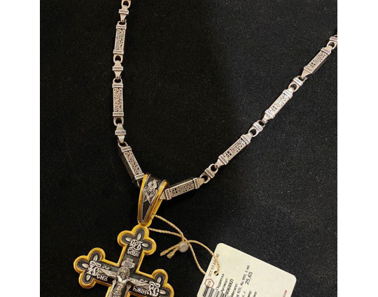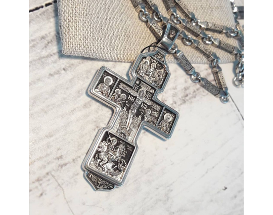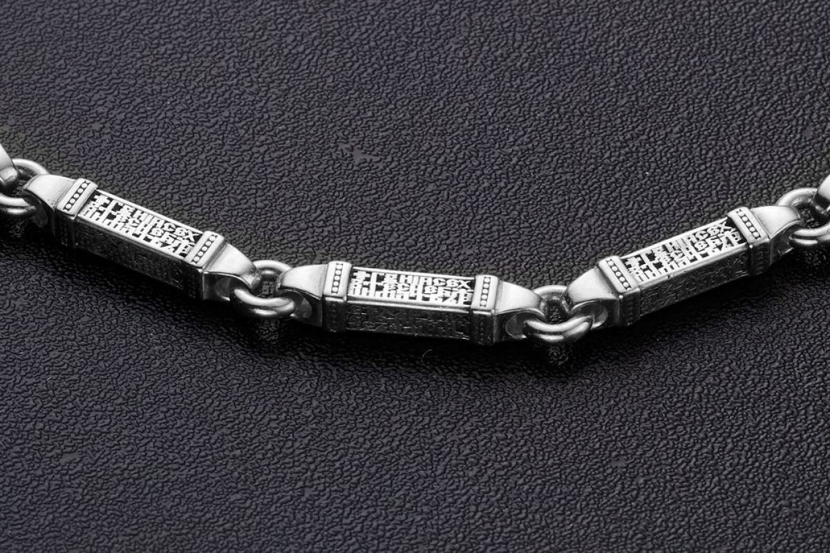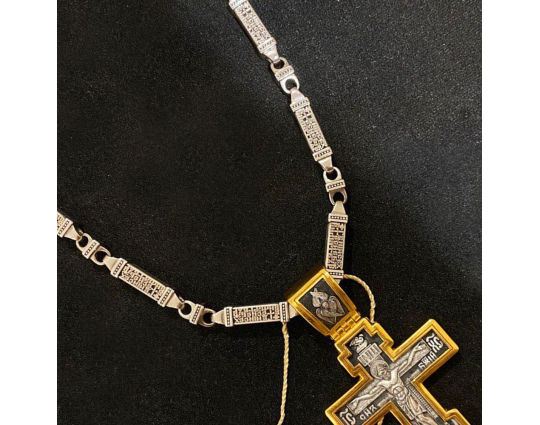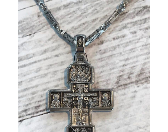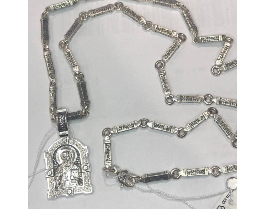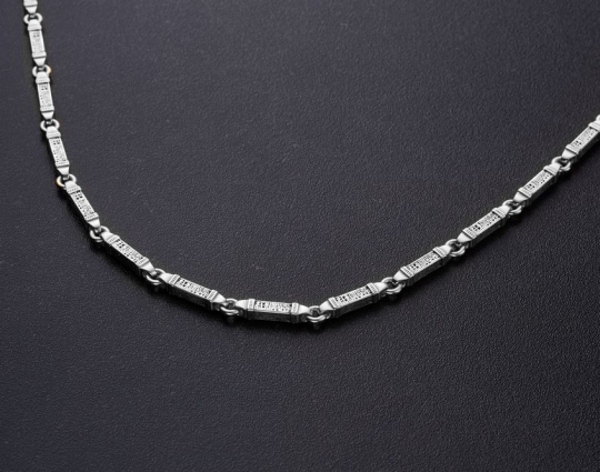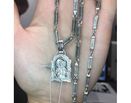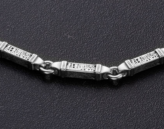 Серебряная цепь с родиевым покрытием, которое защищает изделие от почернения и агрессивного воздействия внешней среды. Цепь состоит из объемных звеньев геометрической формы. На каждом из них написана «Предначинательная молитва», которую можно читать как защитную в сложных и опасных ситуациях, так и помогающую в любых делах.