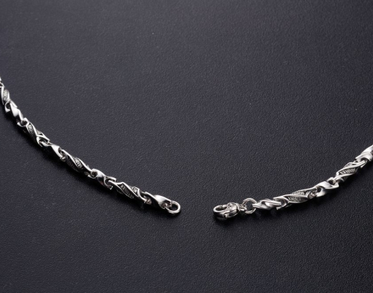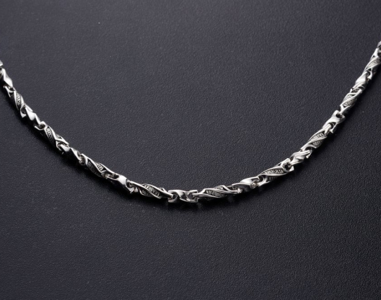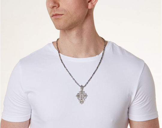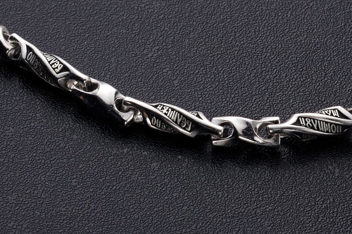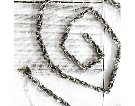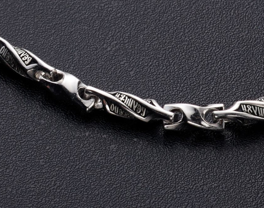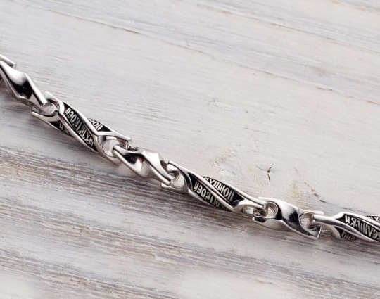 Серебряная цепь с родиевым покрытием, которое защищает изделие от почернения и агрессивного воздействия внешней среды. Цепь состоит из литых звеньев необычной формы. На каждом из них написаны Божественные слова: первая строка из Псалма Давида, состоящего в целом из размышлений о милости Господней, которая посылается нам, когда необходимо, и об испытаниях человека.