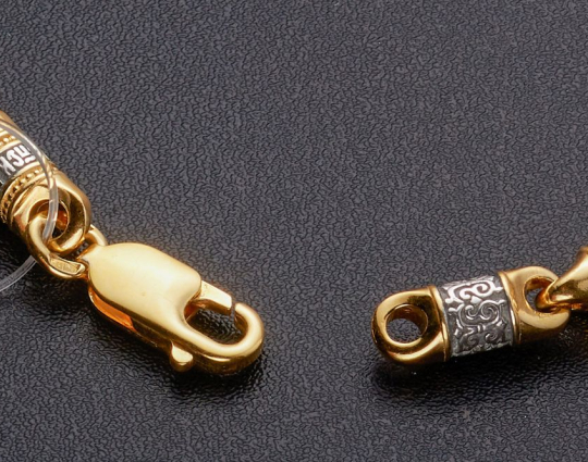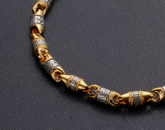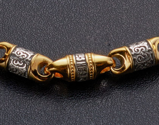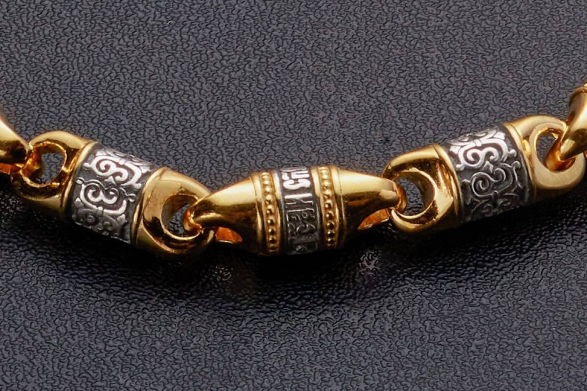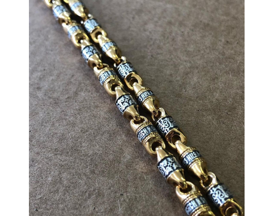 Серебряная цепь с позолоченной отделкой. Она состоит из литых звеньев, которые чередуются между собой. На одном из них написано обращение Всевышнему - молитва "Господи Спаси и Сохрани", на другом - нанесен изящный византийский орнамент.