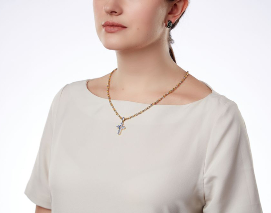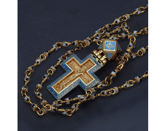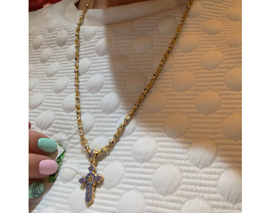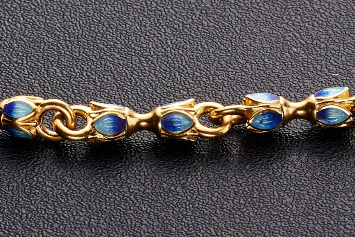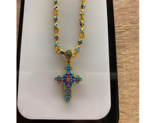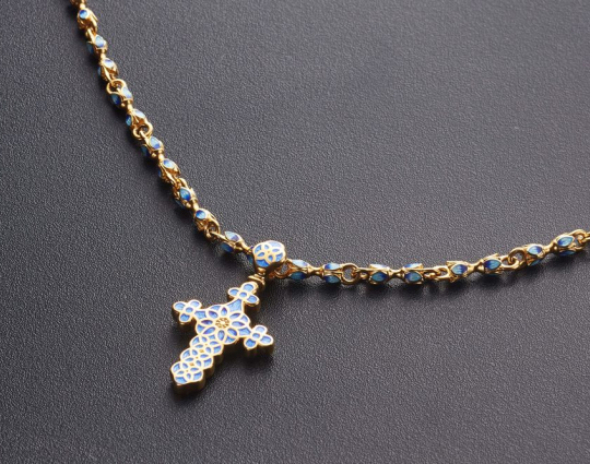 Позолоченная цепь с изящными звеньями в виде бутонов весенних, пасхальных цветов - тюльпанов. Звенья украшены эмалевой росписью нежного небесно-голубого цвета, который ассоциируется с пробуждением природы после долгой зимы и холодов.