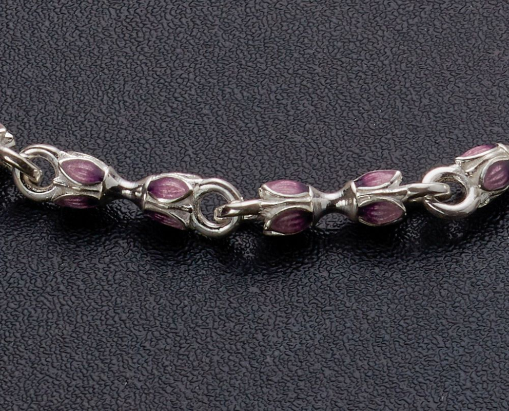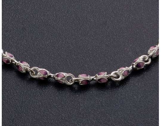 Серебряная цепь с изящными звеньями в виде бутонов весенних, пасхальных цветов - тюльпанов. Звенья украшены эмалевой росписью нежного розового оттенка, который ассоциируется с пробуждением природы после долгой зимы и холодов.