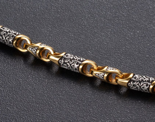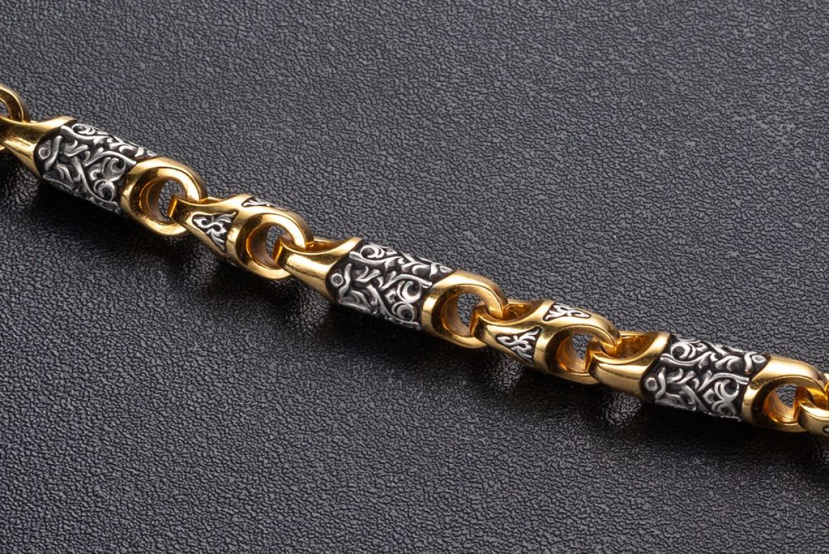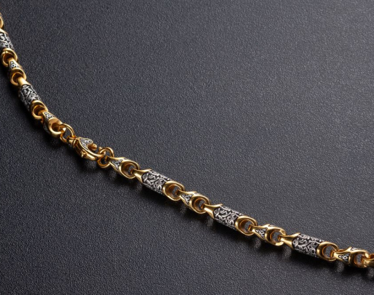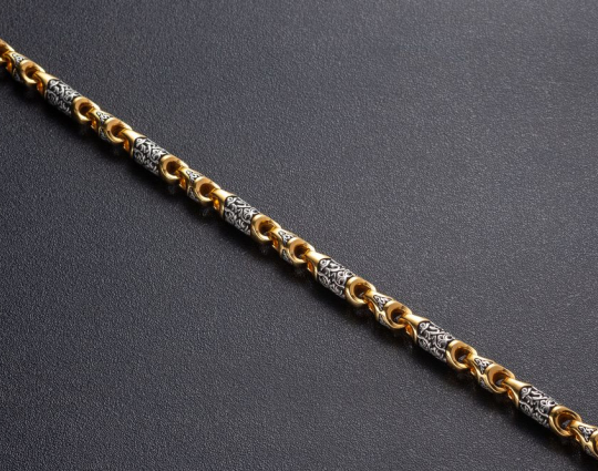 Серебряная цепь с позолотой, состоящая из литых звеньев необычной формы, на которые нанесен изящный орнамент. Сам корпус звена затемнен.