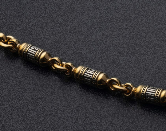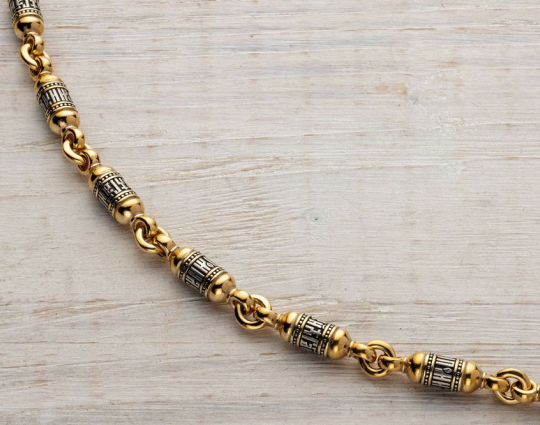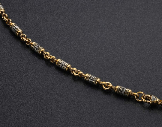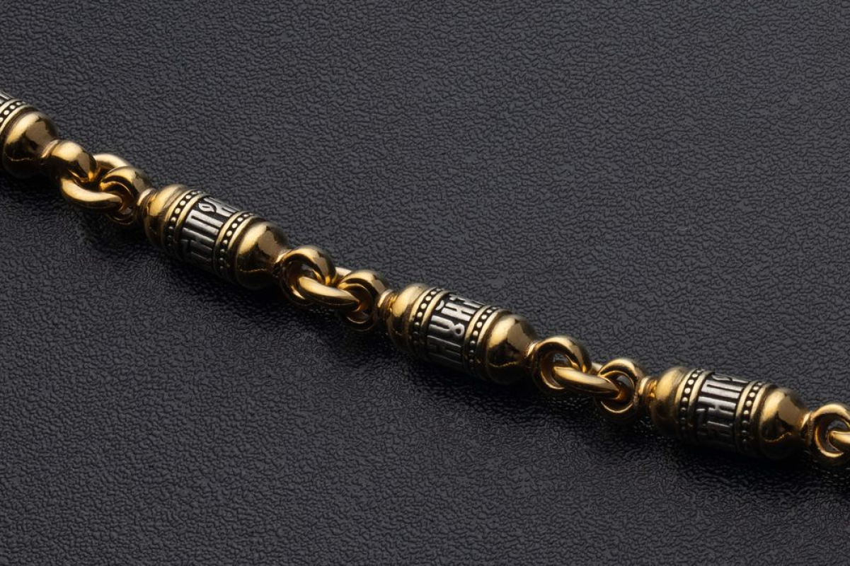Серебряная цепочка с позолотой, которая состоит из литых цилиндрических звеньев с молитвой "Господи, помилуй". Эта молитва помогает уберечь душу и разум в чистоте, избавиться от греховных мыслей, страхов и сомнений.