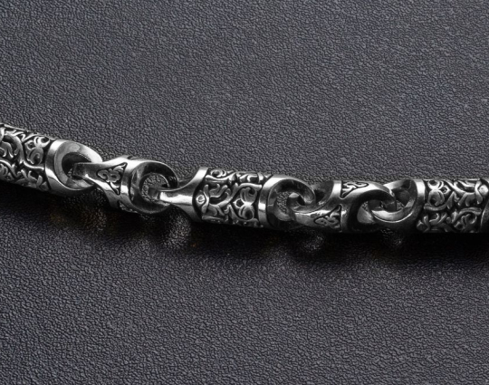 Серебряная цепь с родиевым покрытием, которое защищает изделие от почернения и агрессивного воздействия внешней среды. Цепь состоит из литых звеньев цилиндрической формы, на которые нанесен изящный византийский орнамент. Сам корпус звена затемнен.