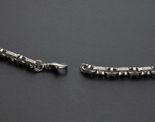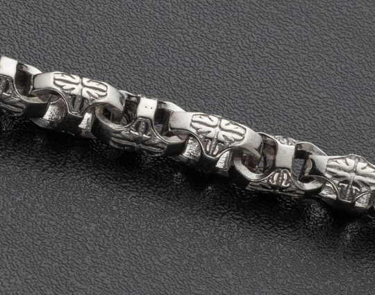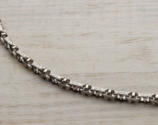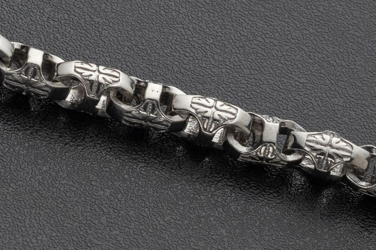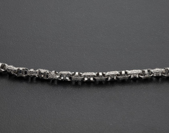 На звеньях этой литой цепочки из серебра 925 пробы с родиевым покрытием изображен орнамент в форме креста из растительного орнамента. Строгое, простое исполнение придает эффект самодостаточности, а эксклюзивный орнамент делает украшение изящным.