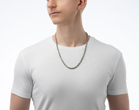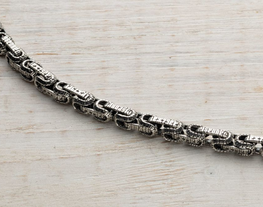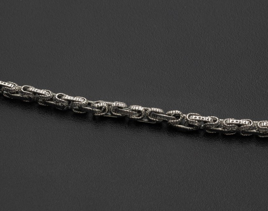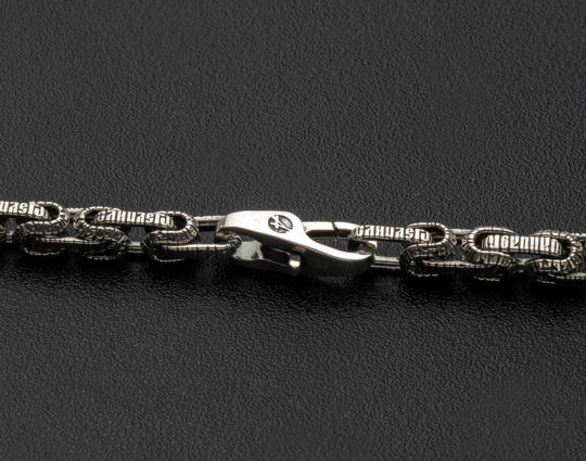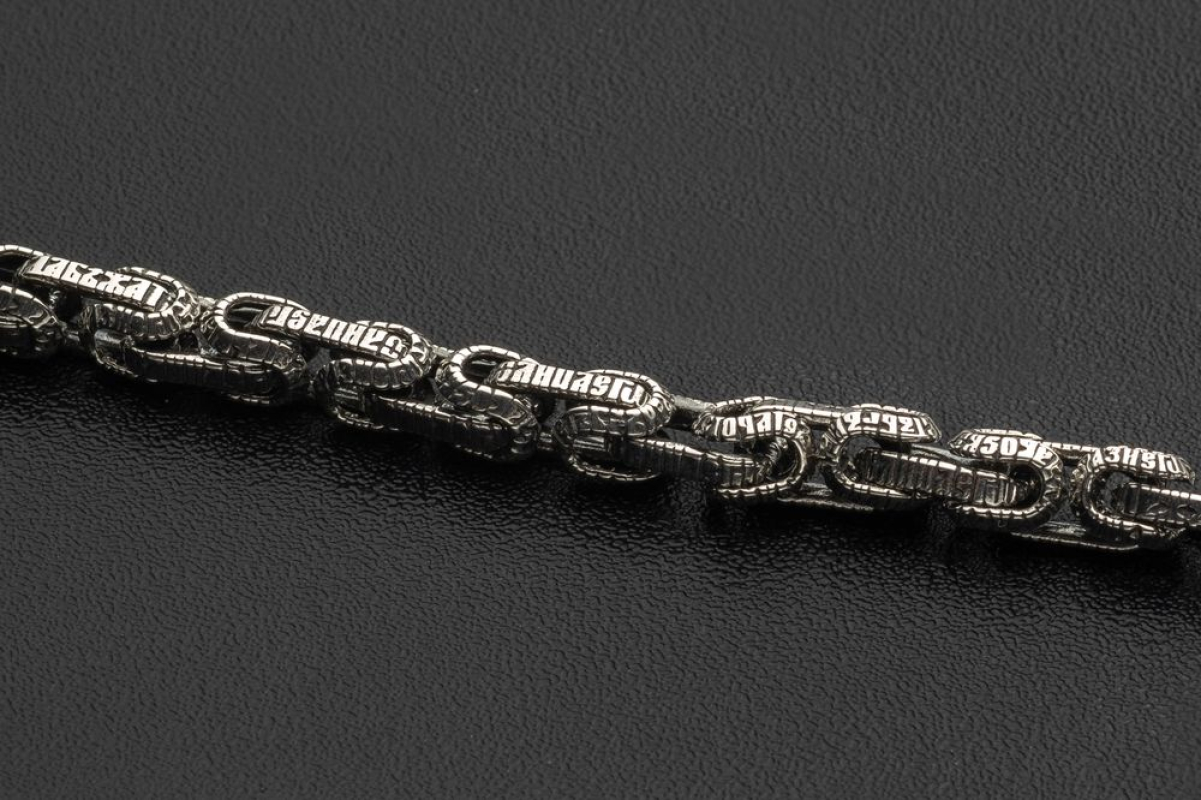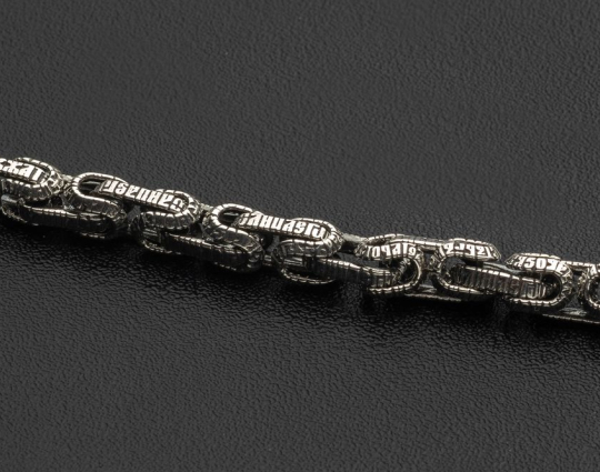 Плетение цепочки носит название «Византия». Изделие изготовлено вручную. На каждом звене изображены первые слова молитвы Животворящему Кресту: «Да воскреснет Бог, и расточатся врази Его, и да бежат от лица Его ненавидящии Его». Эта молитва читается в опасности, при сложных обстоятельствах, для избавления от страхов, тревог, сомнений, для борьбы с искушениями.