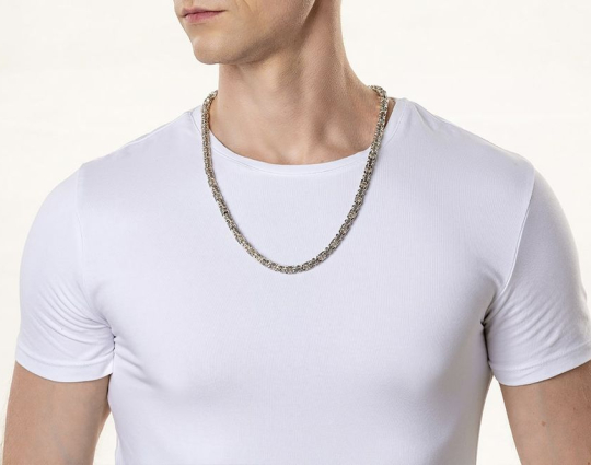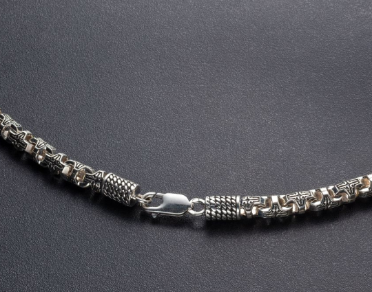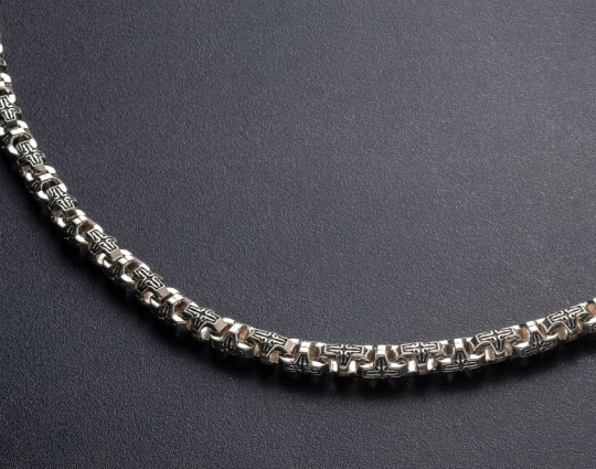 Серебряная цепь, собранная из литых полнотелых звеньев, поверхность которых украшена изящным и лаконичным узором на чернении. Это придает цепи необычный, но очень эффектный вид. Такую  цепь можно носить как индивидуальное ювелирное украшение, так и в сочетание с образками и крестиками, которые можно найти в специальных разделах нашего магазина.