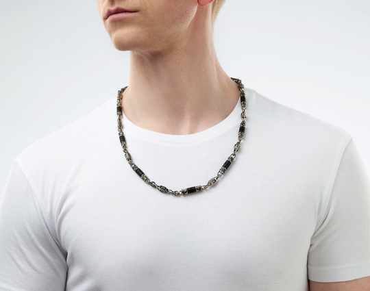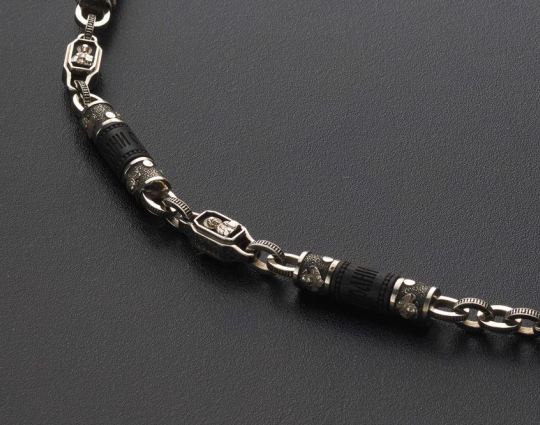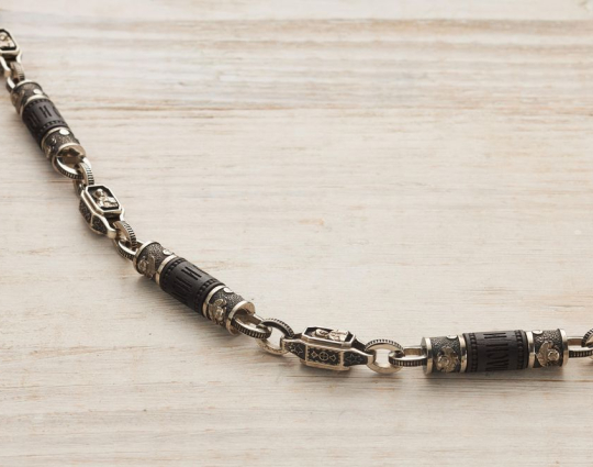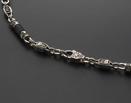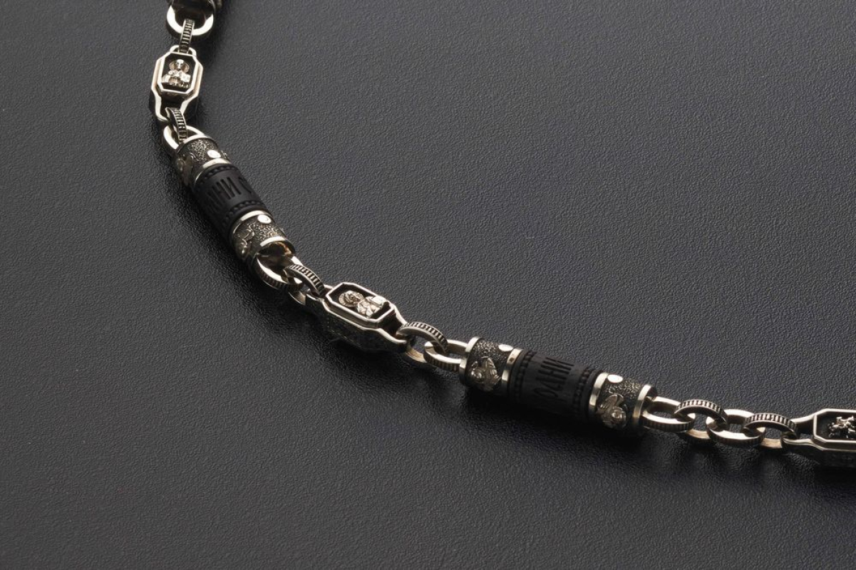 Мужскую цепь изготовлена из серебра 925 пробы на основе чёрного дерева Эбен. На деревянной части находятся слова "Спаси и Сохрани". На серебряных звеньях изображены образы Иисуса Христа, Казанской иконы Божьей Матери, Святого Николая Чудотворца и Георгия Победоносца.