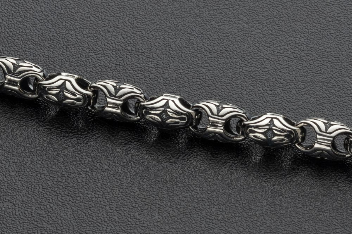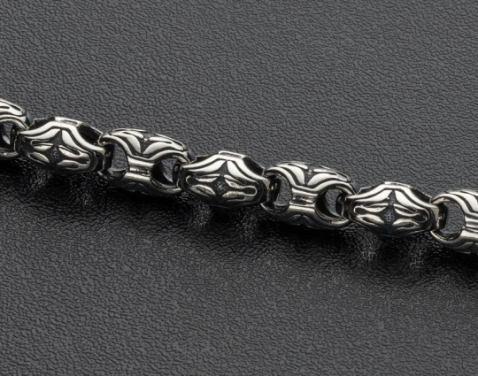 На звеньях этой литой цепочки из серебра 925 пробы изображен славянский орнамент с плавными и округлыми линиями. Строгое, простое исполнение придает эффект самодостаточности, а эксклюзивный орнамент делает украшение изящным.