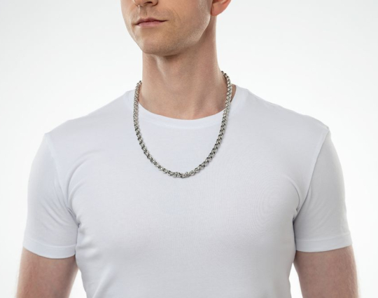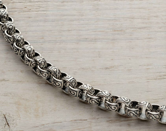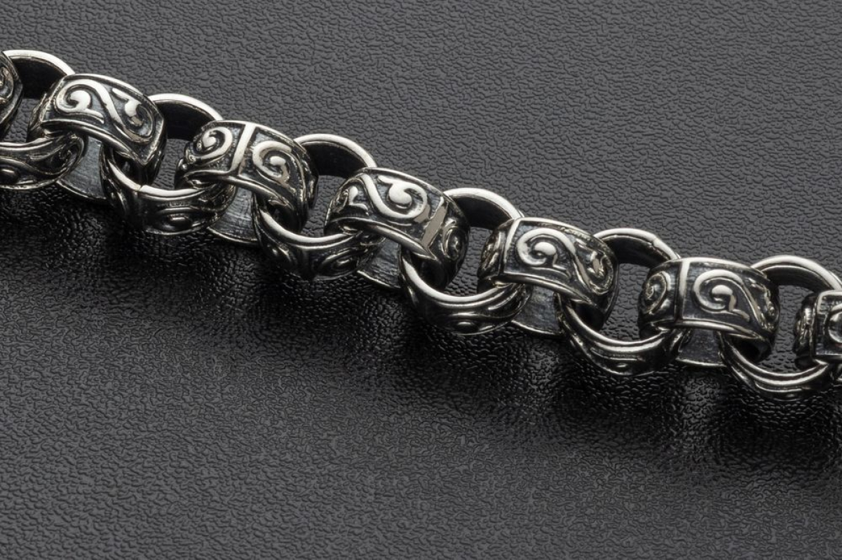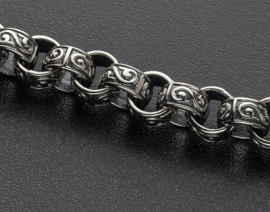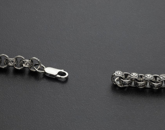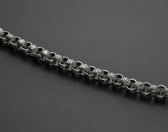 На звеньях этой литой цепочки из серебра 925 пробы изображен растительный орнамент. Строгое, простое исполнение придает эффект самодостаточности, а эксклюзивный орнамент придает изящный эффект.