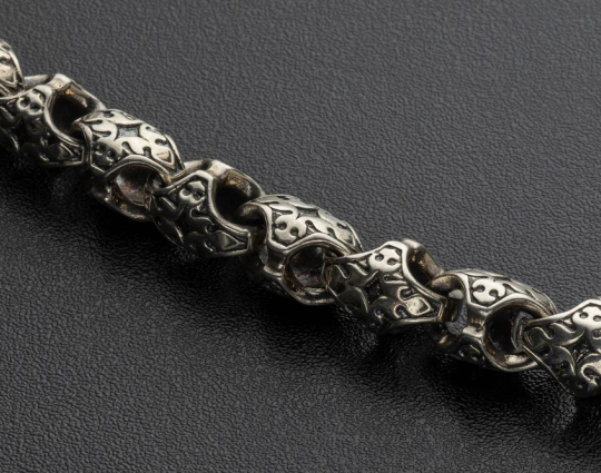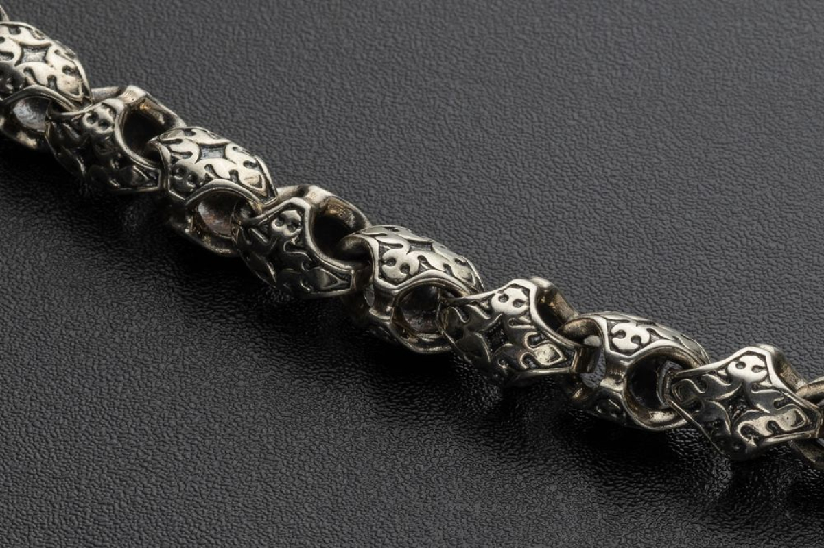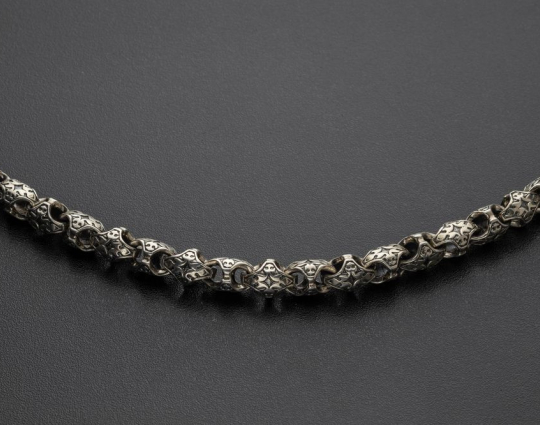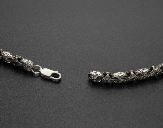 Изящная литая цепочка из серебра 925 пробы с орнаментом на звеньях ромбовидной формы.