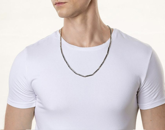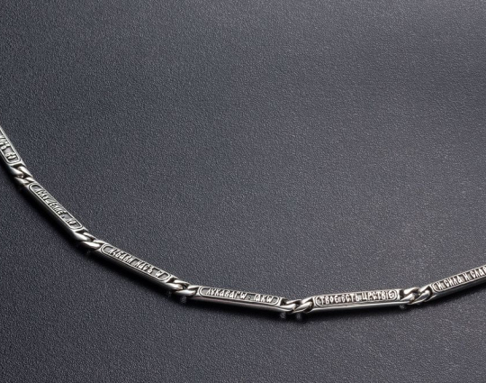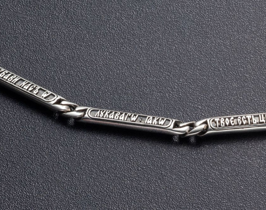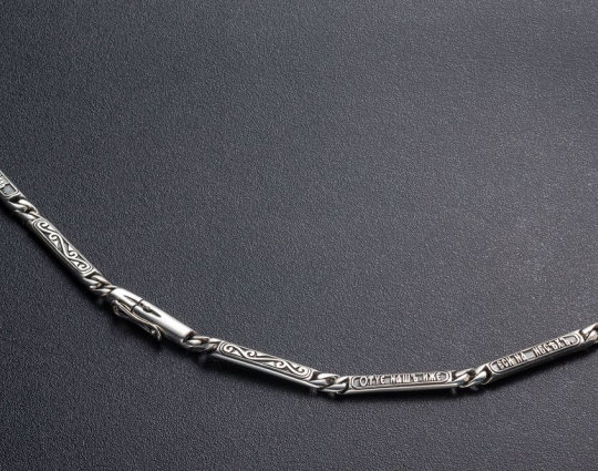 Серебряная цепь, состоящая из звеньев плоской формы. На них написана самая известная и сильная православная молитва, которые верующие читают практически в любой ситуации:  с ней просят помощи у Бога в опасности, защиты ближних от неприятностей и болезней, мира и спокойствия для своего дома.