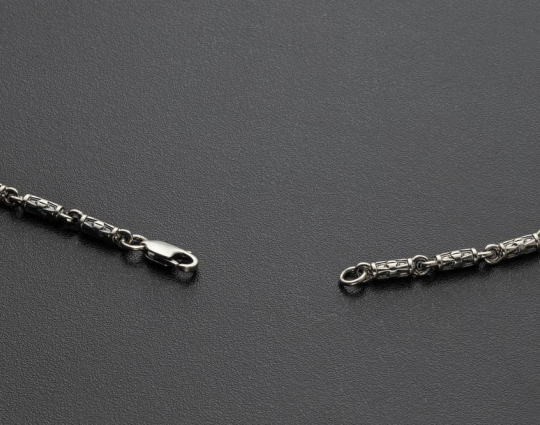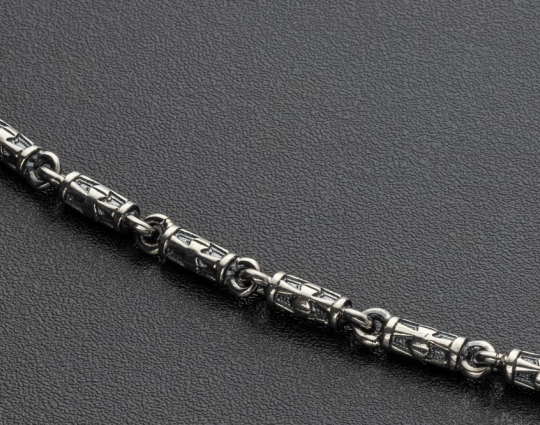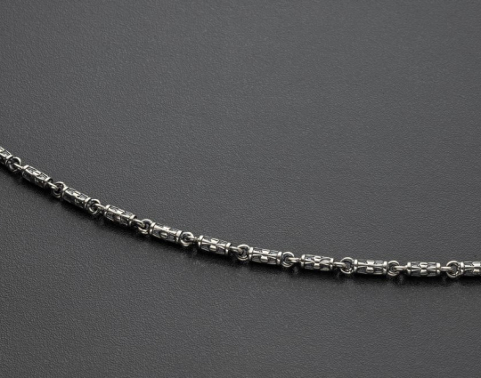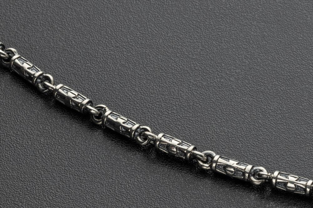 Литая цепочка из серебра 925 пробы с орнаментом в виде крестика на каждом звене. При длине 55 см. примерный вес составит 23 грамма.