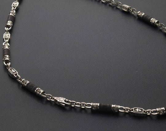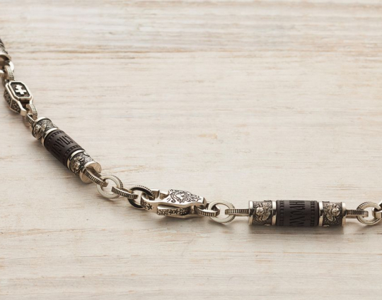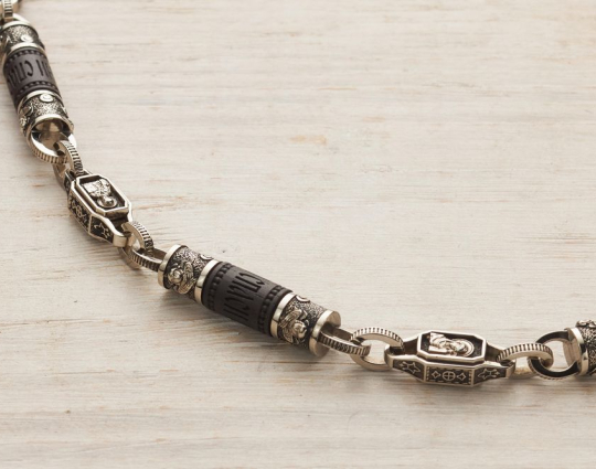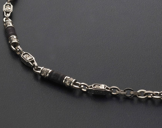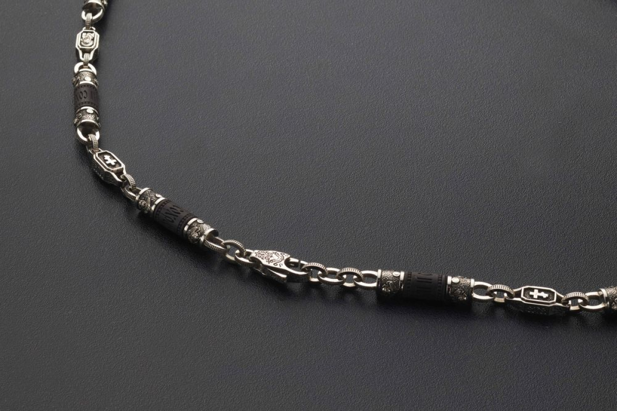 Мужскую цепь изготовлена из серебра 925 пробы на основе чёрного дерева Эбен. На деревянной части находятся слова "Спаси и Сохрани". На серебряных звеньях изображены образы Иисуса Христа, Казанской иконы Божьей Матери, Святого Николая Чудотворца и Георгия Победоносца.