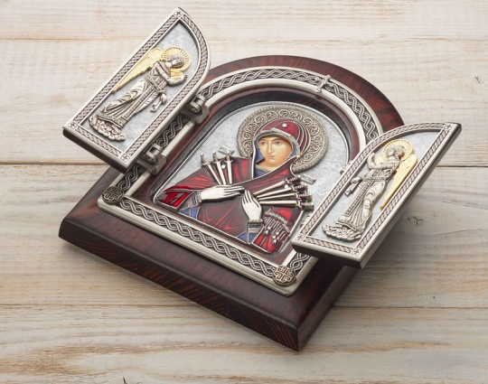 Образ покрыт эмалью. На створках изображены ангелы, украшенные позолотой и фианитами. Деревянная основа выполнена из ценных пород дерева.