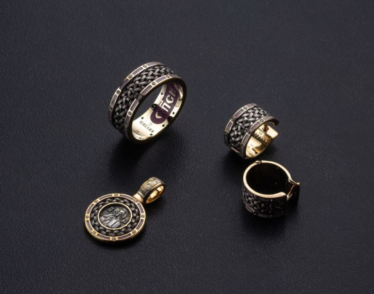 Серебряные переплетающиеся нити присутствуют на каждом украшении из набора, как и фианиты. На кольце с внутренней стороны выгравирована молитва "Спаси, Господи, и помилуй". Этой молитвой просят даровать благополучие и избавить от несчастий.