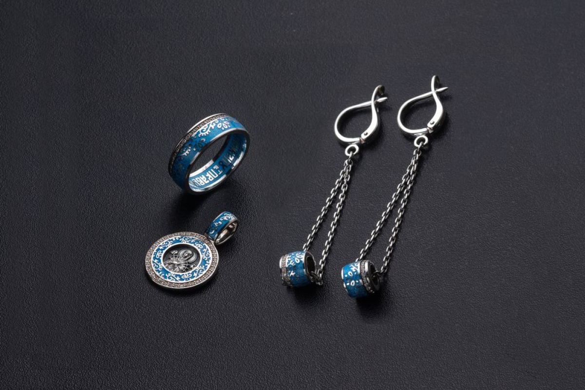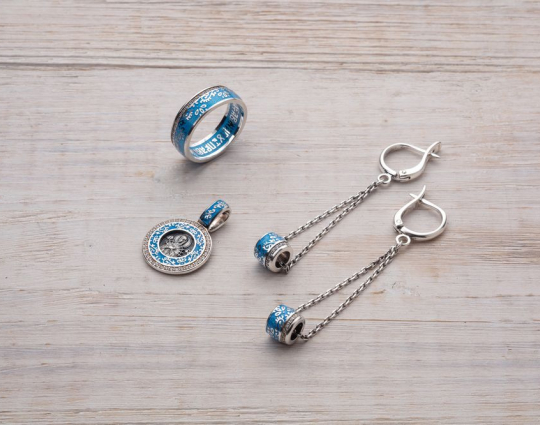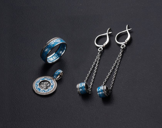 Серебряный набор «Семистрельная икона Богородицы» | 03_078A_02_078A_20_178A_blackcyan | Серебро 925 пробы, эмаль, фианиты