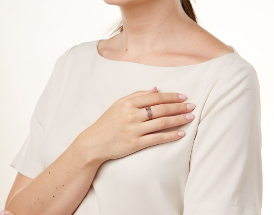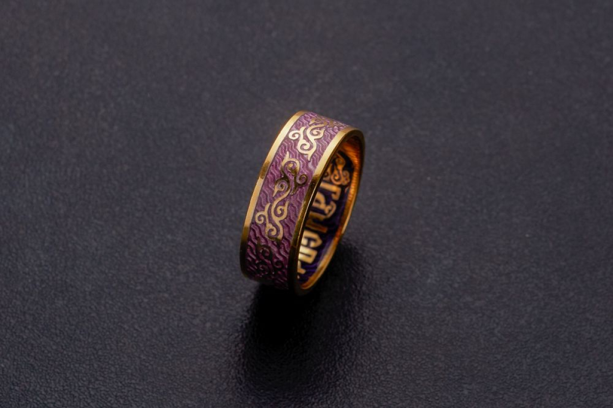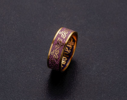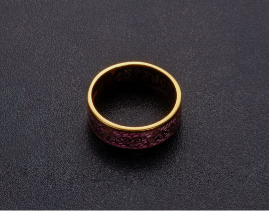 Широкое женское кольцо, отделанное тонкими позолоченными ободками и объемным позолоченным узором из завитков, которые отдаленно напоминают византийский орнамент. Корпус заполнен темно-бордовой эмалью, которая переливается на свету.