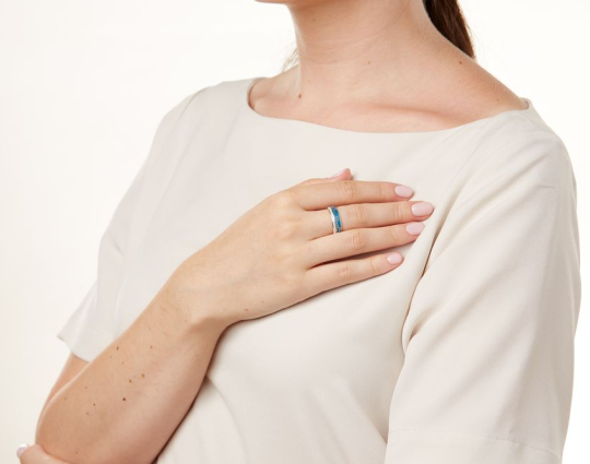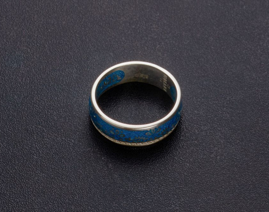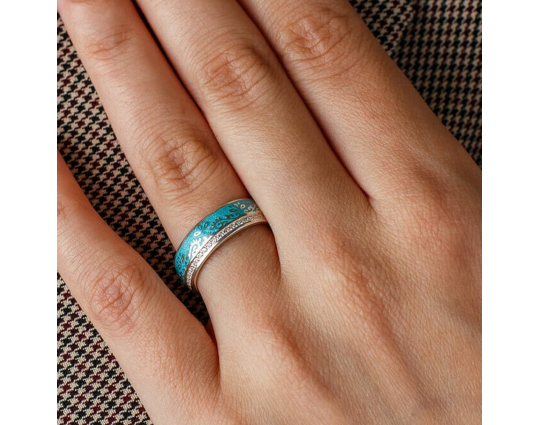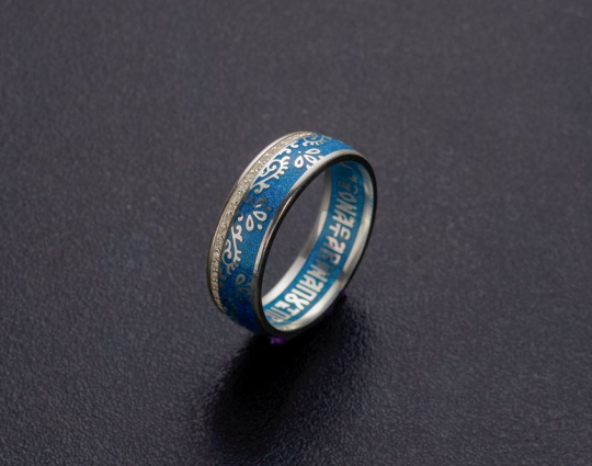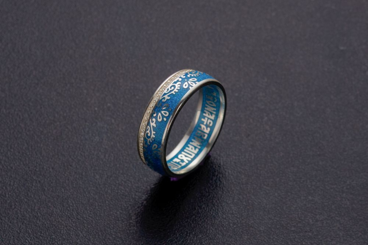 Серебряное кольцо с нежно-голубым эмалевым покрытием по внешней и внутренней стороне. На внешнюю сторону также нанесен изящный растительный орнамент. По ободку расположена узкая дорожка из фианитов. Внутри кольца - обращение к Богородице «Иверской» - О Пресвятая Дево, настави на путь правый нас / О Пресвятая Дева, наставь на путь правый нас. Считается, что она покровительствует тем, кто хочет стать на путь истинный.