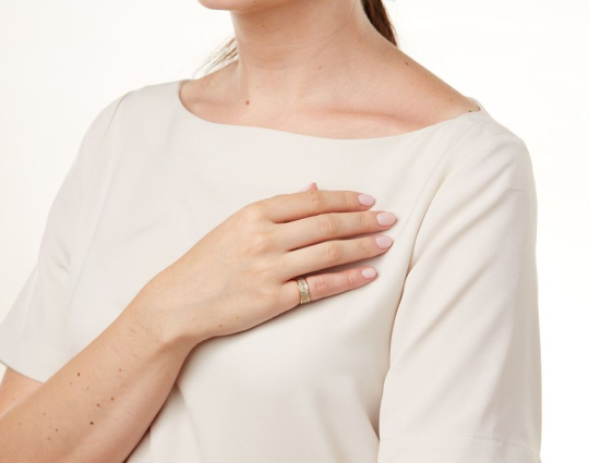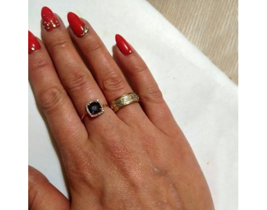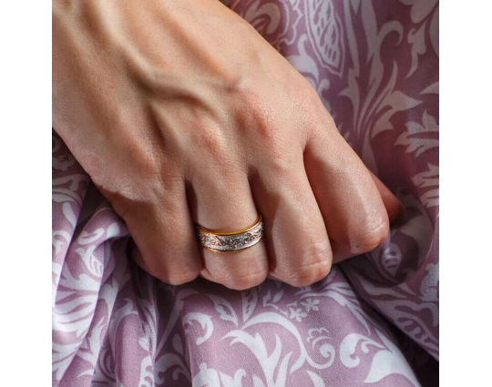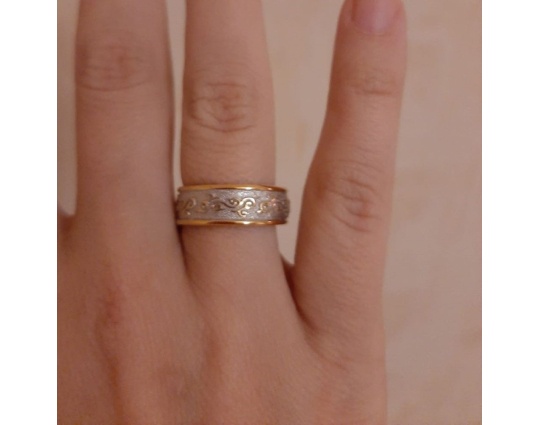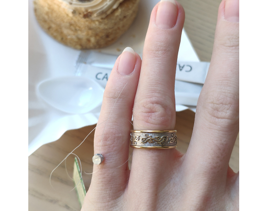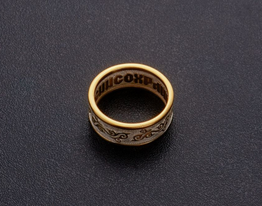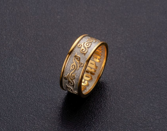 Широкое женское кольцо, отделанное тонкими позолоченными ободками и объемным позолоченным узором из завитков, которые отдаленно напоминают византийский орнамент. Внутри кольца – слова - обращения к Богу, к которым мы прибегаем в сложные моменты.