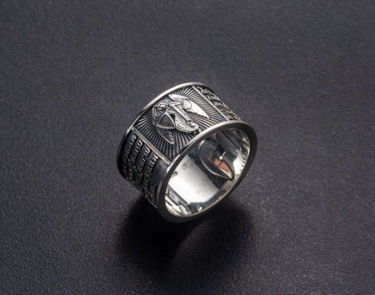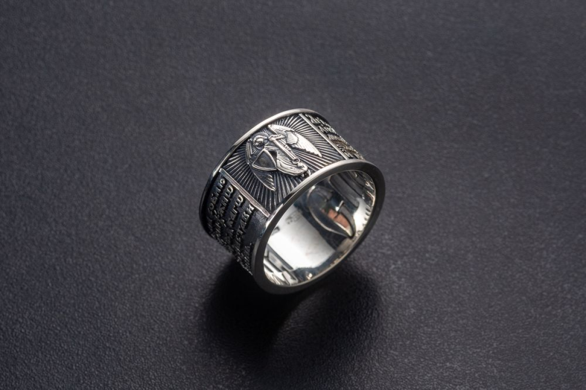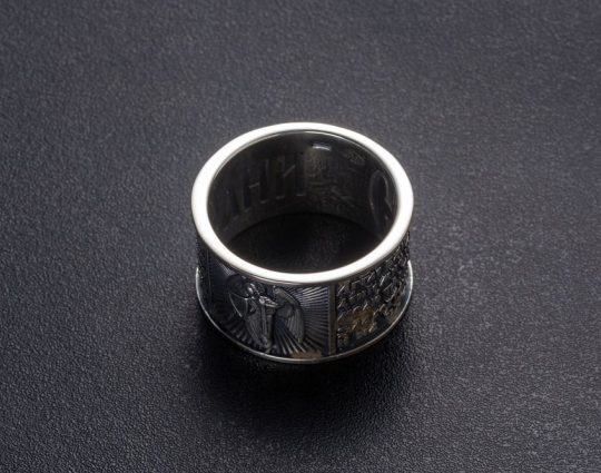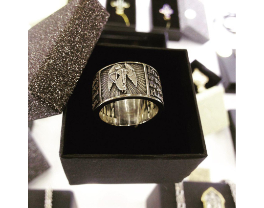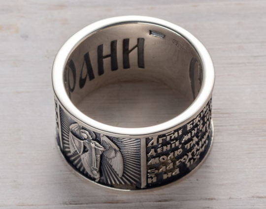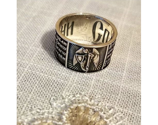 Серебряное кольцо, на корпусе которого - изображение Ангела Хранителя.  Он приходит к каждому из нас при Крещении и сопровождает нас до конца дней. Ангел Хранитель помогает нам и охраняет нас от бед, всегда, когда мы просим его об этом, ведь действовать по своей воле он не может. Поэтому к нему нужно обращаться при вечерней молитве. Слова молитвы размещены на корпусе кольца.