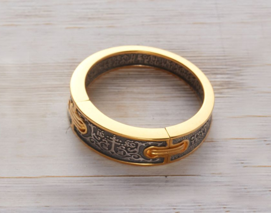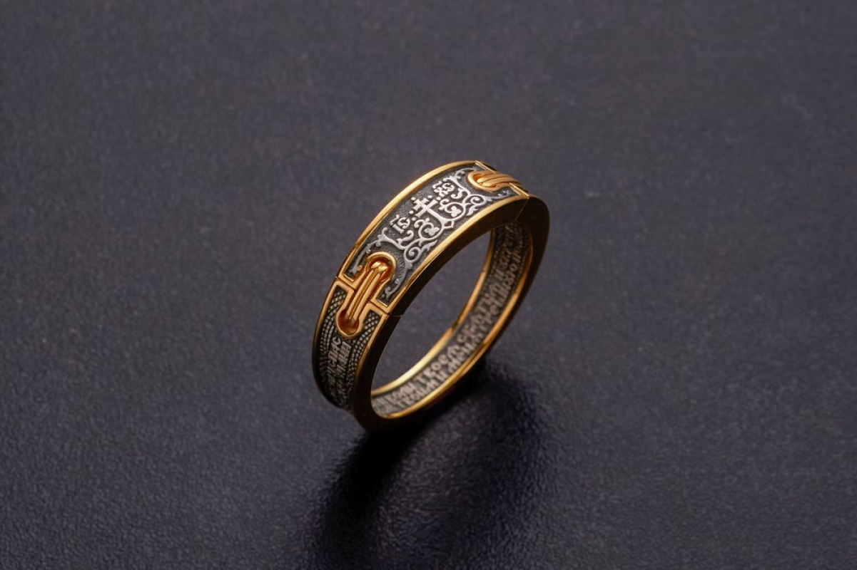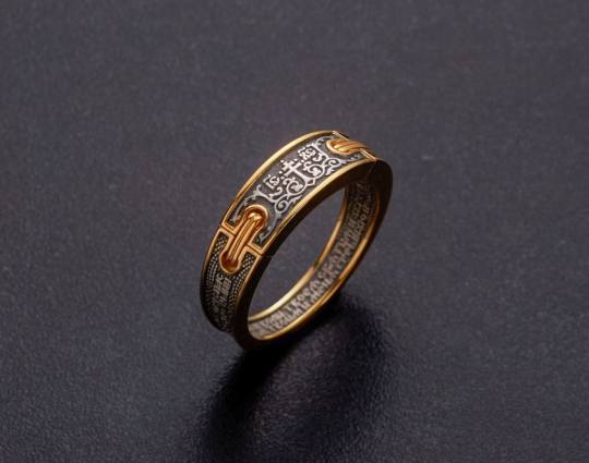 На кольце находятся слова молитвы о Детях прп. Амвросия Оптинского. Она наполнена любовью к своим детям и просьбой защитить их в трудное время.
