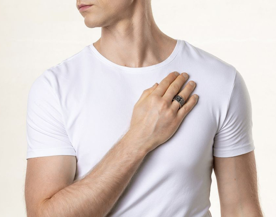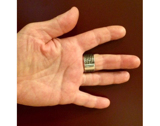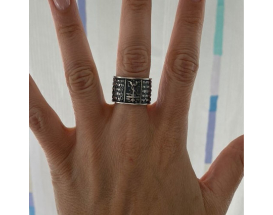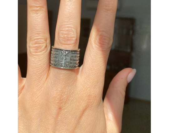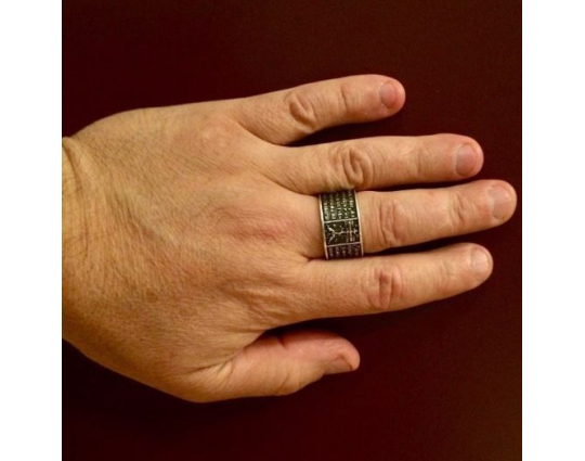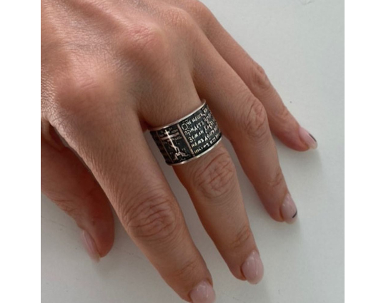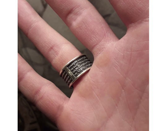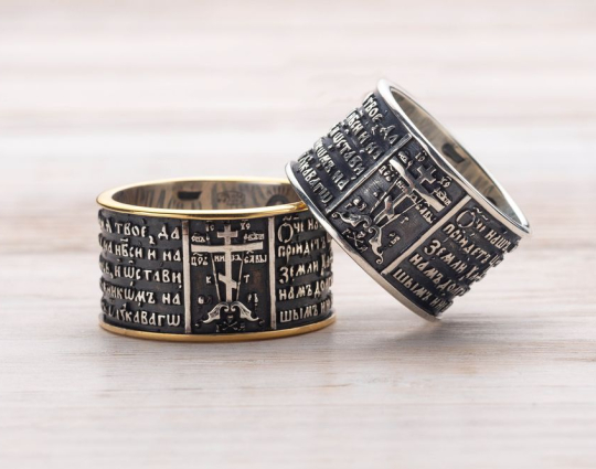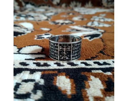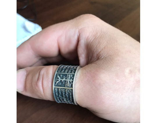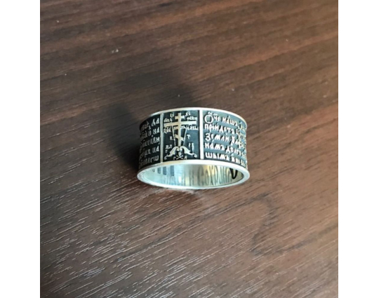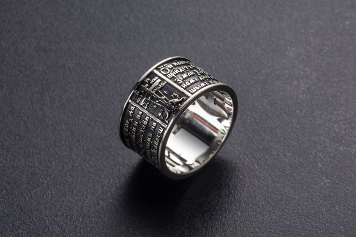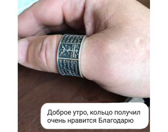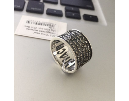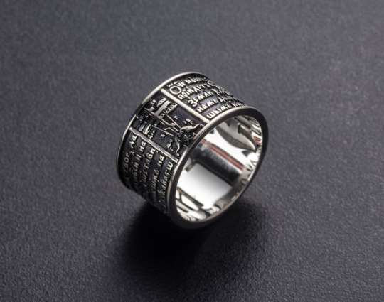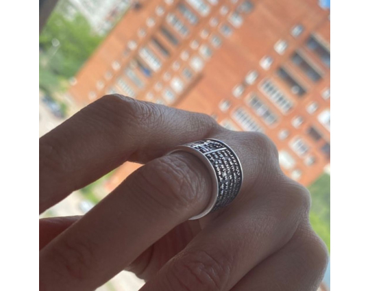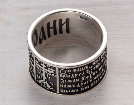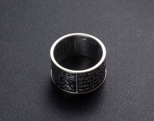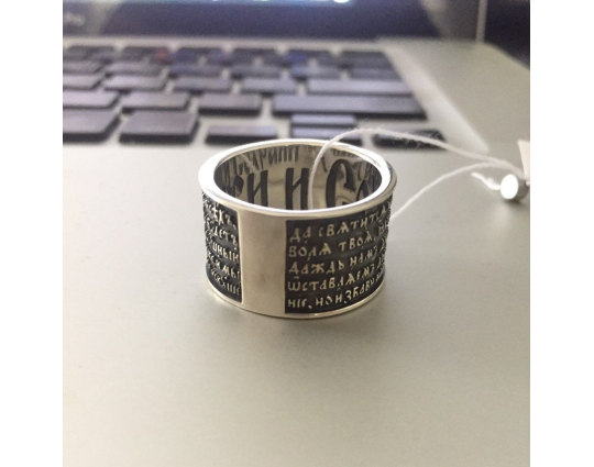 Мужское серебряное кольцо, на корпус которого нанесен полный текст самой главной молитвы для всех христиан - "Отче Наш". Эту молитву дал своим ученикам сам Иисус, когда они просили Его научить их молиться. Именно поэтому ее читают практически в любой ситуации.