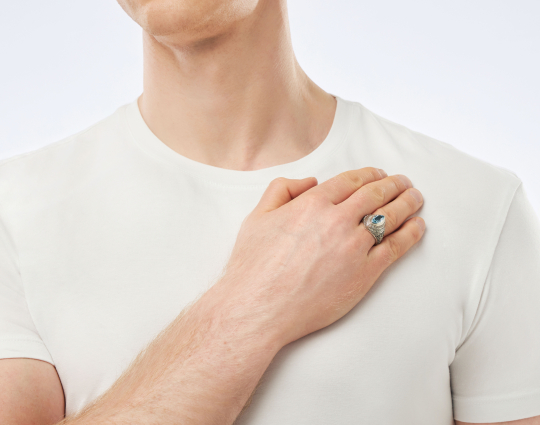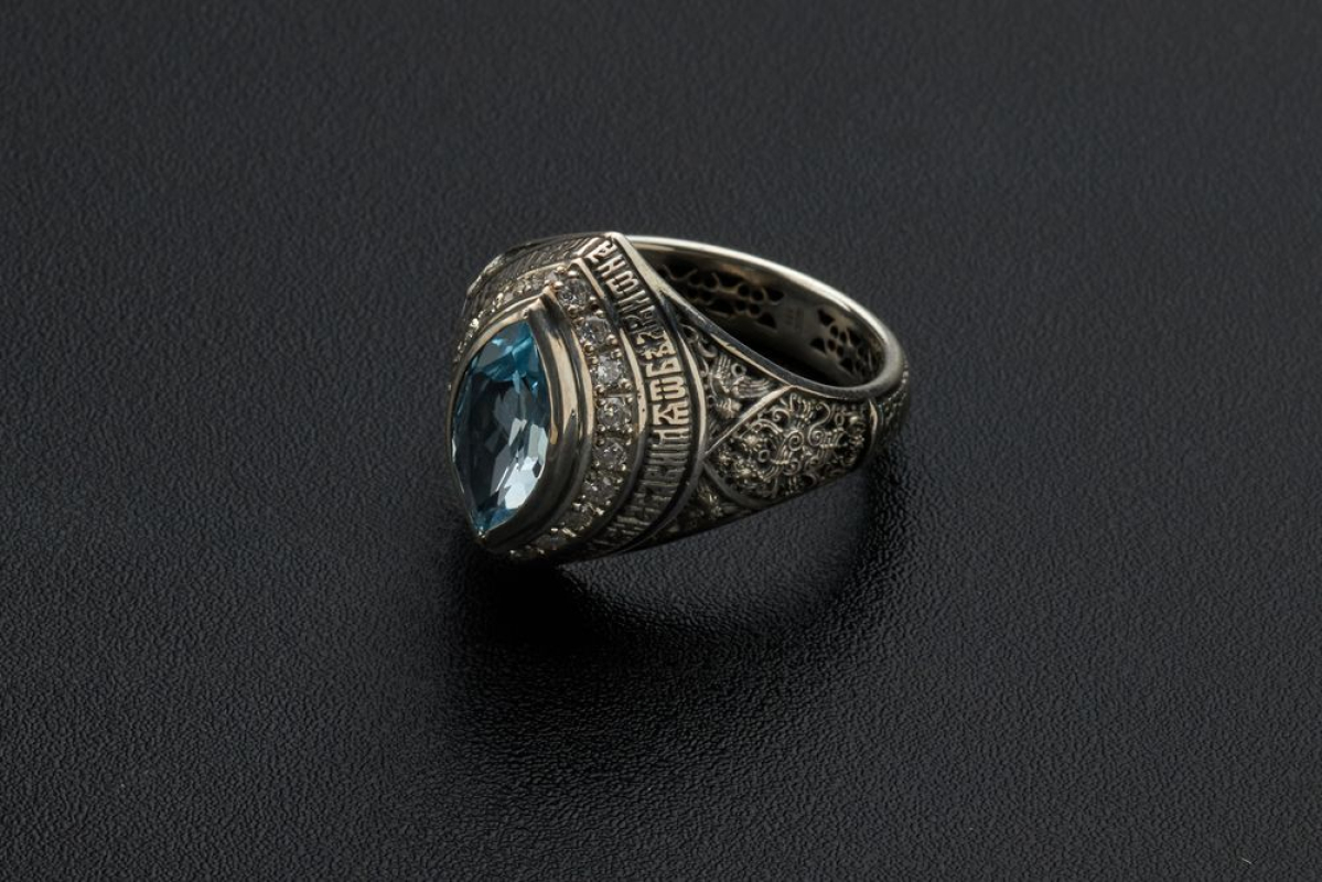 Кольцо выполнено из серебра 925 пробы. В центре находится топаз голубого цвета размером 12*6 мм. По его контуру размещены 18 фианитов. Вокруг камней, внутри шинки и поверхности кольца находятся слова молитв.