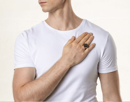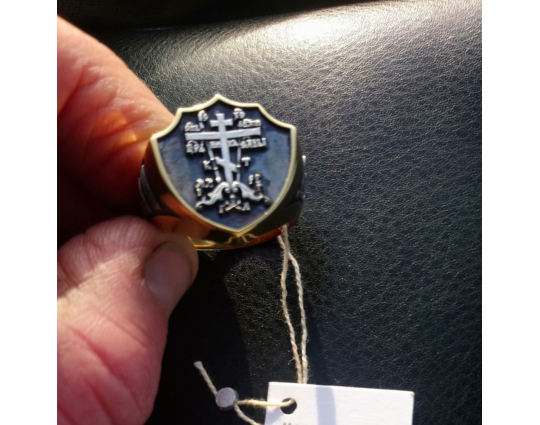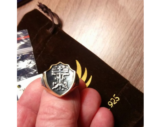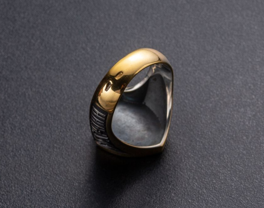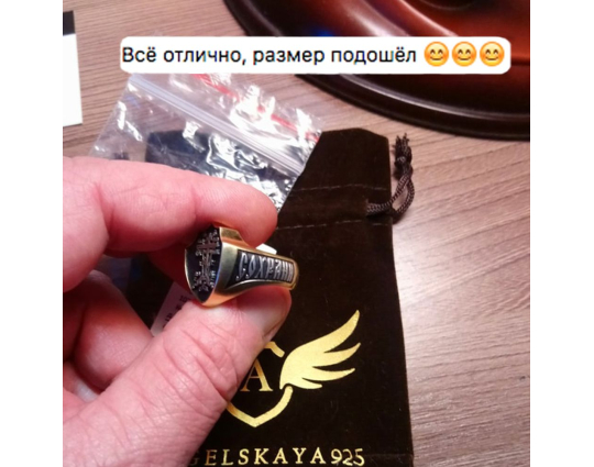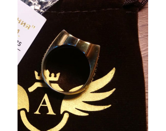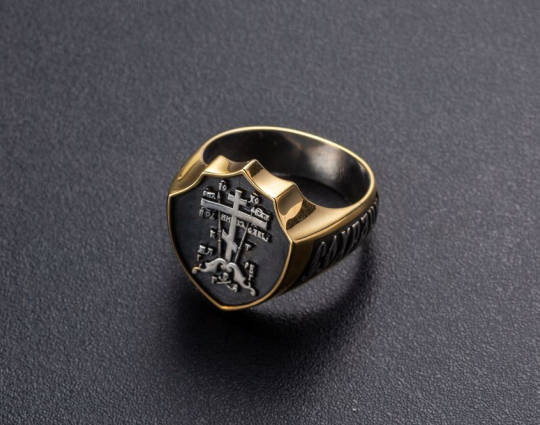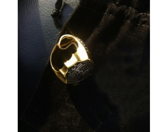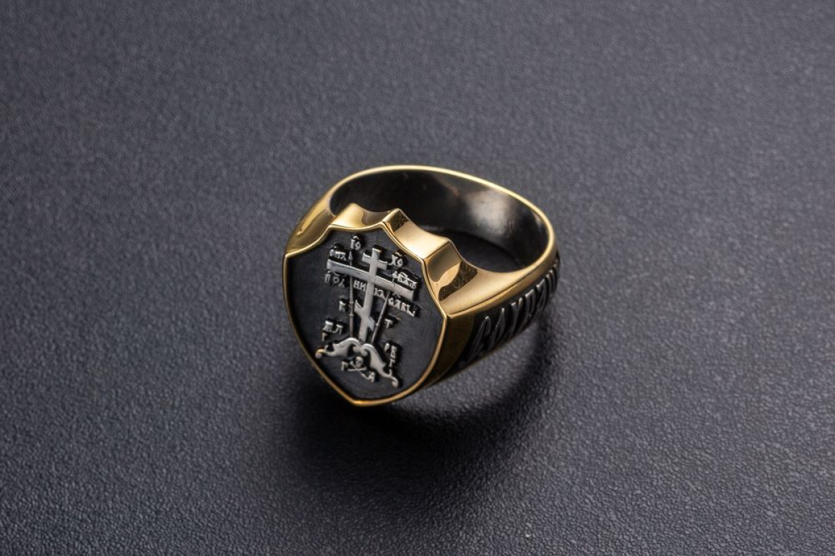 Массивное мужское кольцо в форме печатки с широким позолоченным ободком. На нем  изображен Голгофский крест, на котором был распят Иисус. Это символ веры и вечной жизни.