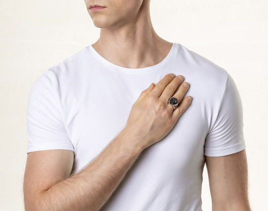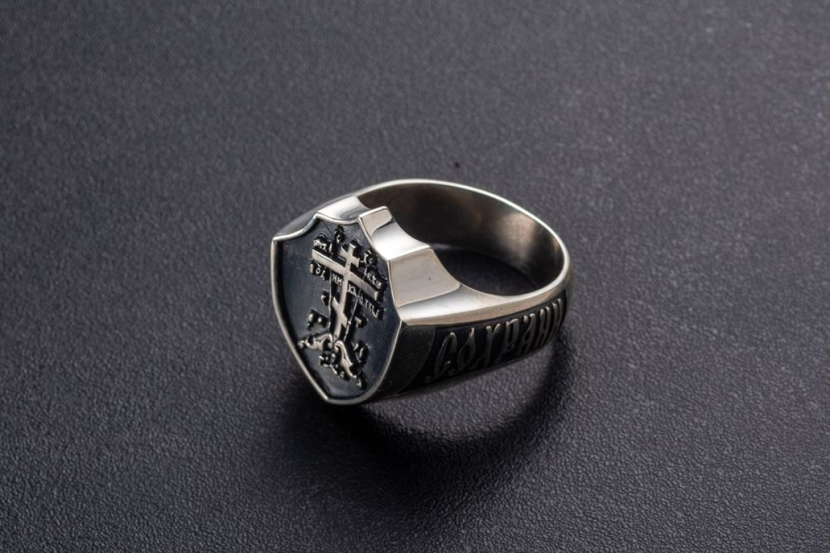 Массивное мужское кольцо в форме печатки. На нем  изображен Голгофский крест, на котором был распят Иисус. Это символ веры и вечной жизни.