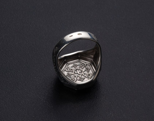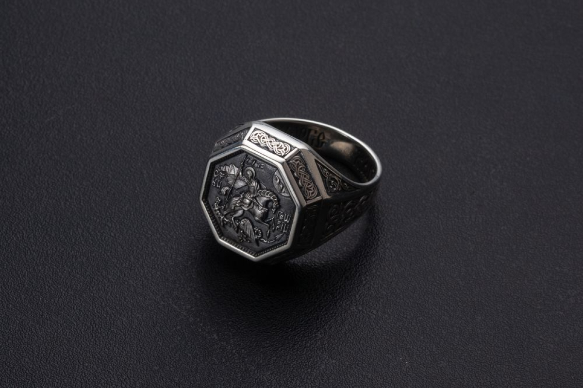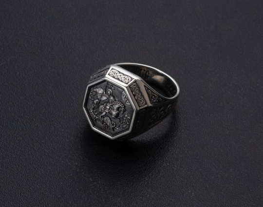 Мужской перстень с  печаткой, на которой изображен Георгий Победоносец во время свершения его знаменитого подвига: победа над змеем. Змей - символ дьявола-искусителя. Победа Георгия означает то, что души верующих будут избавлены от злых намерений, искушений и грехов. Внутри кольца написана короткая молитва на славянском языке, которая просит Бога защитить того, на ком это кольцо.