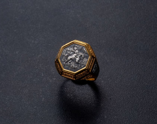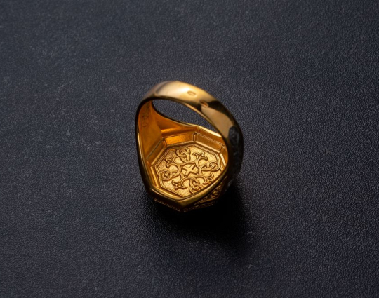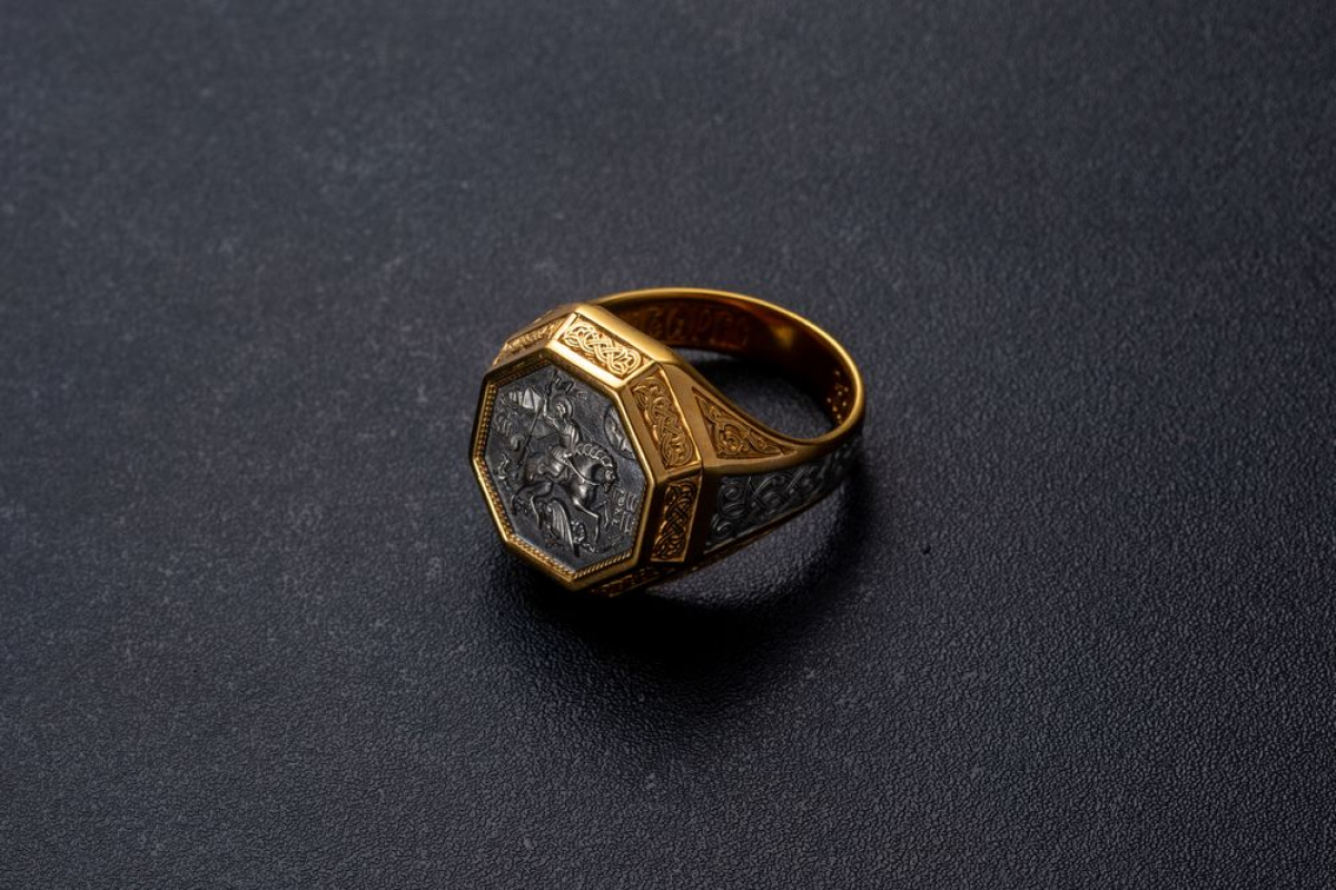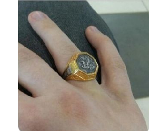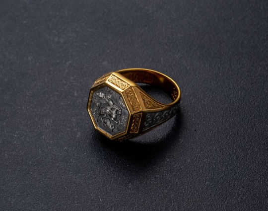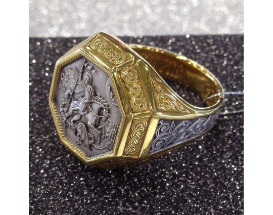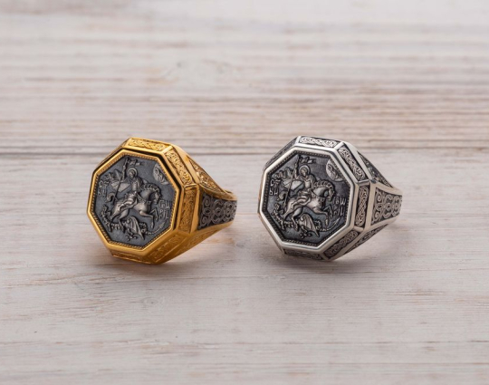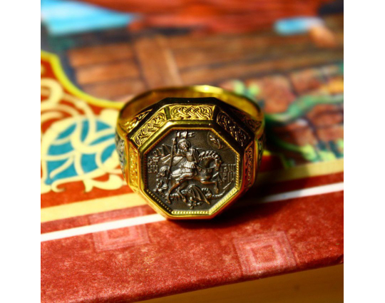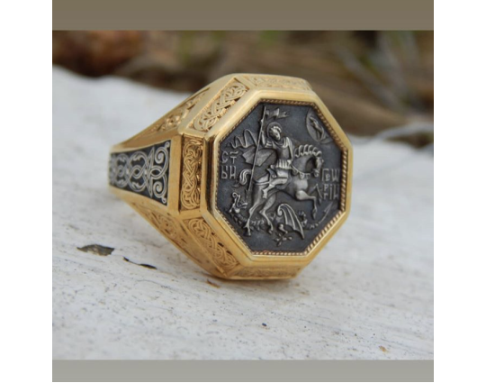Мужской перстень с  печаткой, на которой изображен Георгий Победоносец во время свершения его знаменитого подвига: победа над змеем. Змей - символ дьявола-искусителя. Победа Георгия означает то, что души верующих будут избавлены от злых намерений, искушений и грехов. Внутри кольца написана короткая молитва на славянском языке, которая просит Бога защитить того, на ком это кольцо.