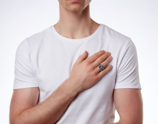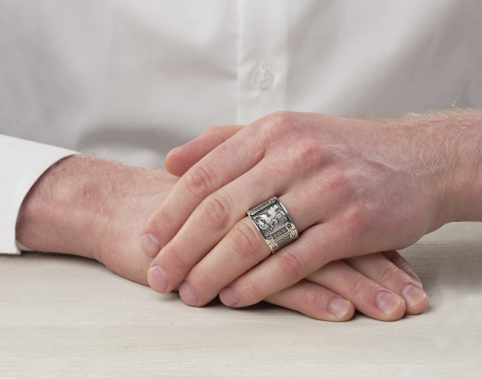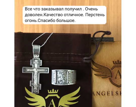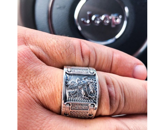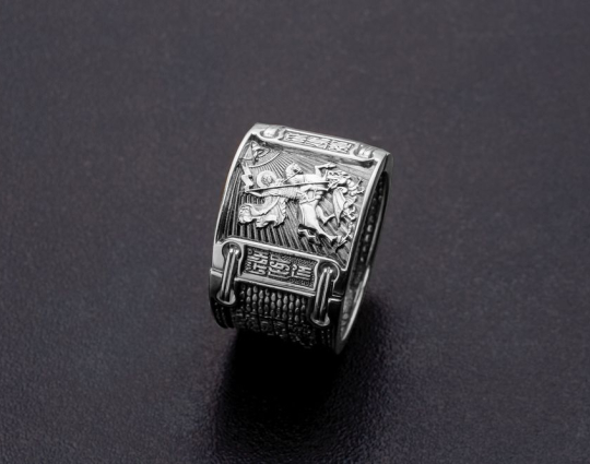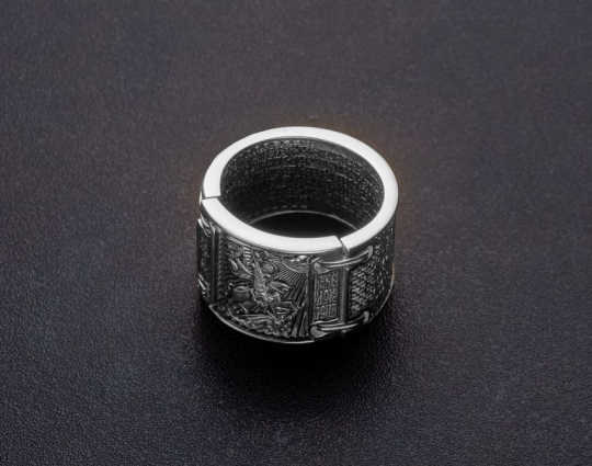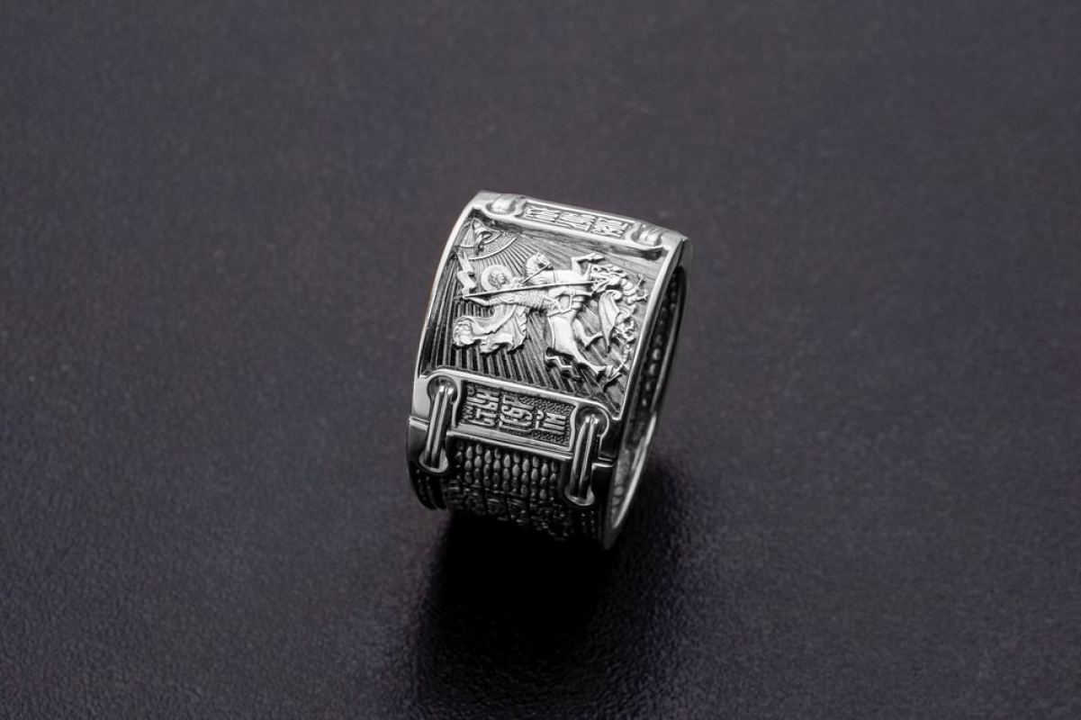 Массивное мужское кольцо на котором изображен Георгий Победоносец и написана молитва.