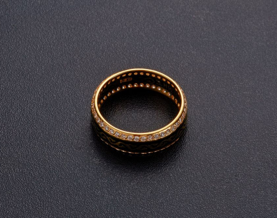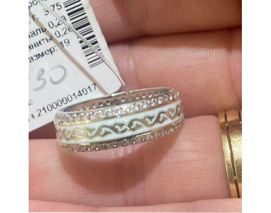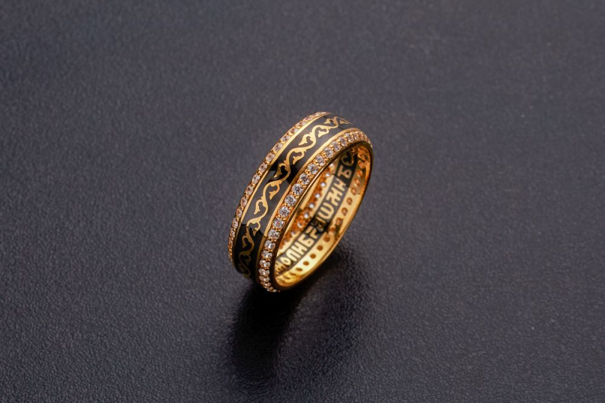 Изящное кольцо из серебра с позолотой и эмалевым покрытием. По внешней части кольцо украшено византийским орнаментом на черном фоне и двумя тонкими линиями фианитов по ободкам.