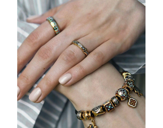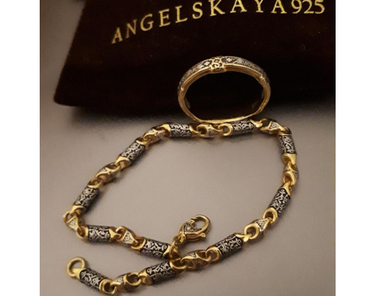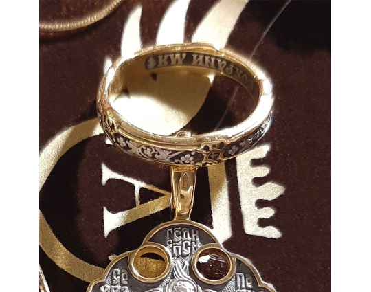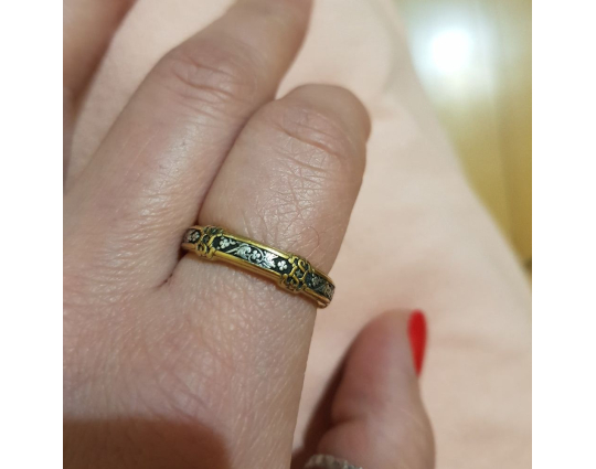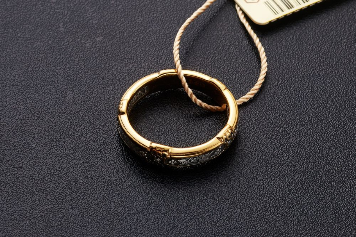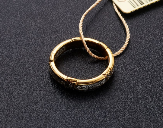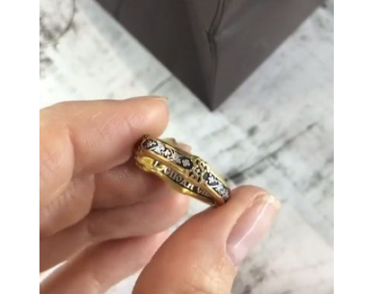 Тонкое, изящное кольцо с орнаментом, который нанесен на затемненный фон. Кольцо имеет позолоченный ободок. На внутренней стороне – слова-обращения к Богу.