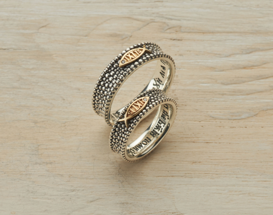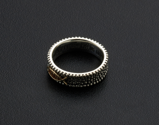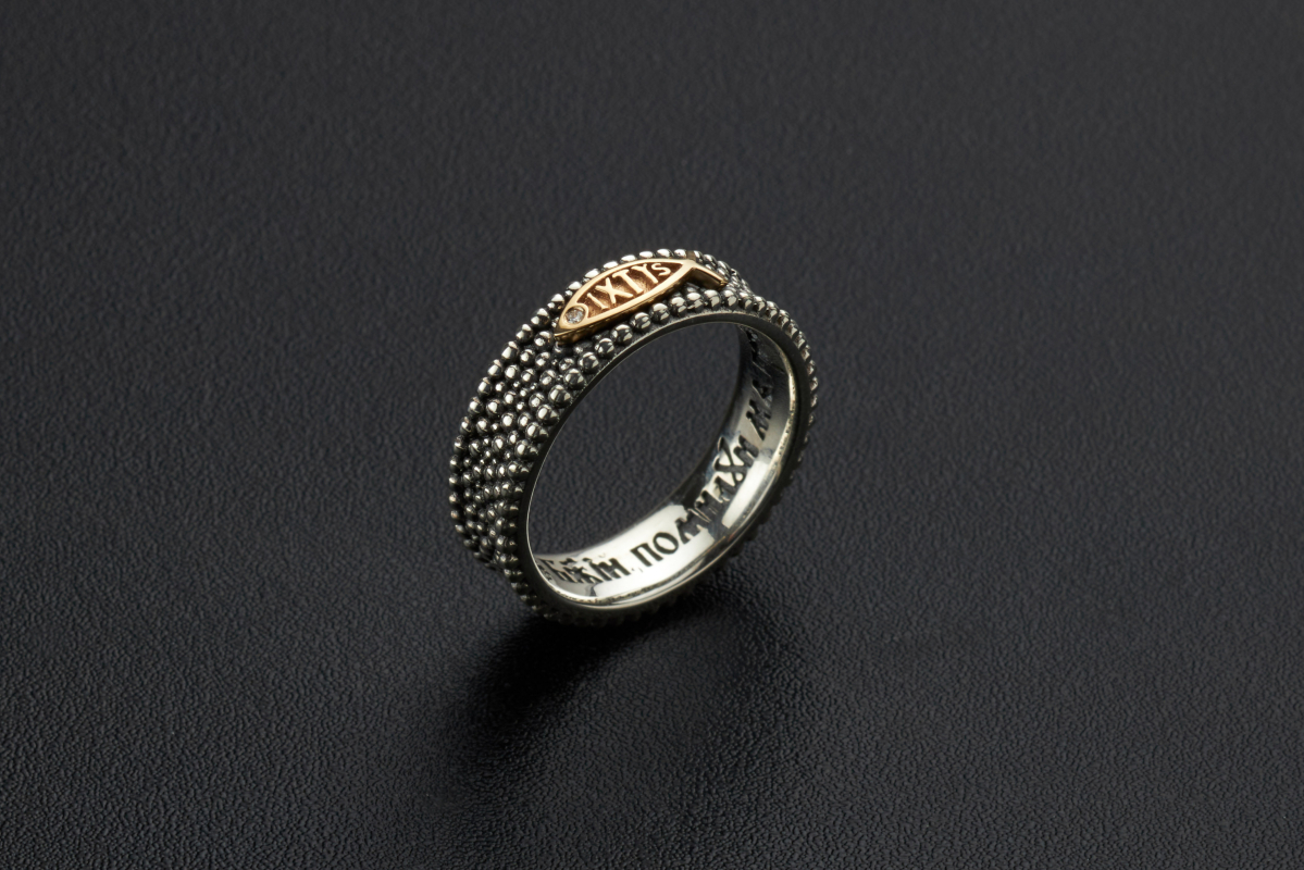 Православное кольцо выполнено из серебра 925 пробы с накладкой в виде рыбки "ИХТИС", покрытой позолотой, и вставленным бриллиантом. Во внутренней стороне кольца размещена молитва на старославянском языке: "Господи Иисусе Христе, Сыне Божий, помилуй мя". Кольцо подойдет как мужчине, так и женщине, красиво смотрятся кольца в паре.