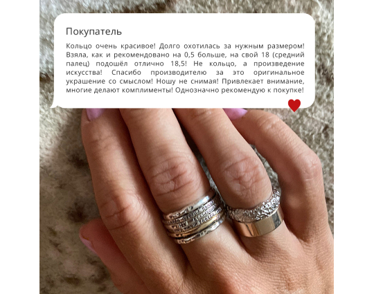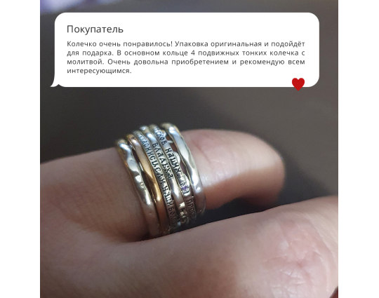 С большим нетерпением ждала это кольцо и оно меня не разочаровал. Очень аккуратно выполнено,красивое и молитва хорошая. Спасибо вам.