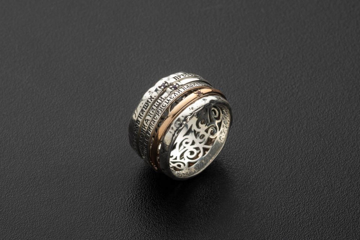 Кольцо выполнено из серебра 925 пробы. На его обручах находятся слова молитвы к Пресвятой Троице. Между ними находятся аметисты. Один обруч покрыт позолотой, фон выполнен в виде растительного орнамента.