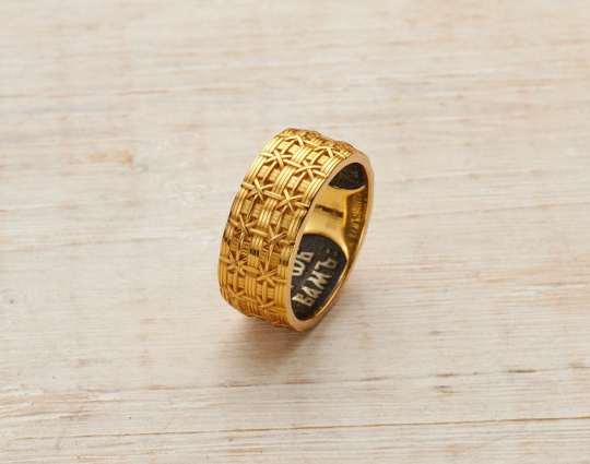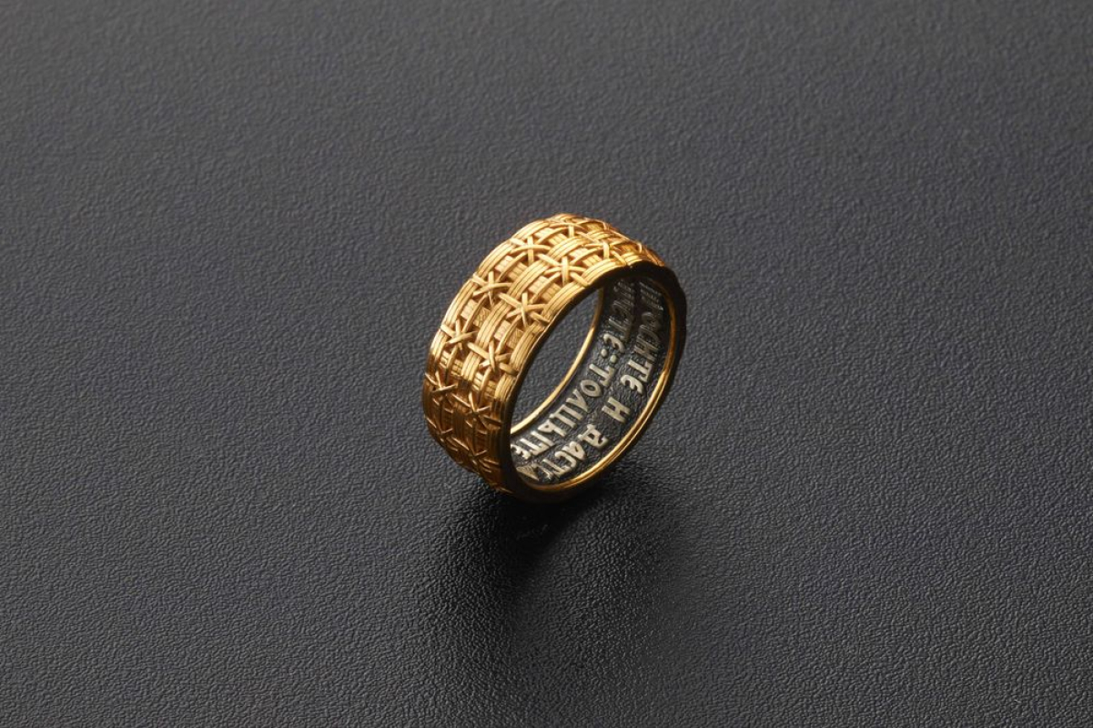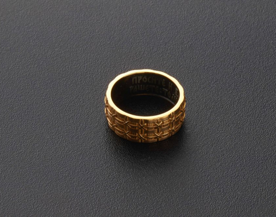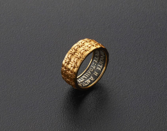 На кольце находятся слова из Евангелия от Матфея 7:7 : "Просите, и дано будет вам; ищите, и найдете; стучите, и отворят вам". Внешняя часть кольца покрыта позолотой и выполнена в виде плетеного орнамента.