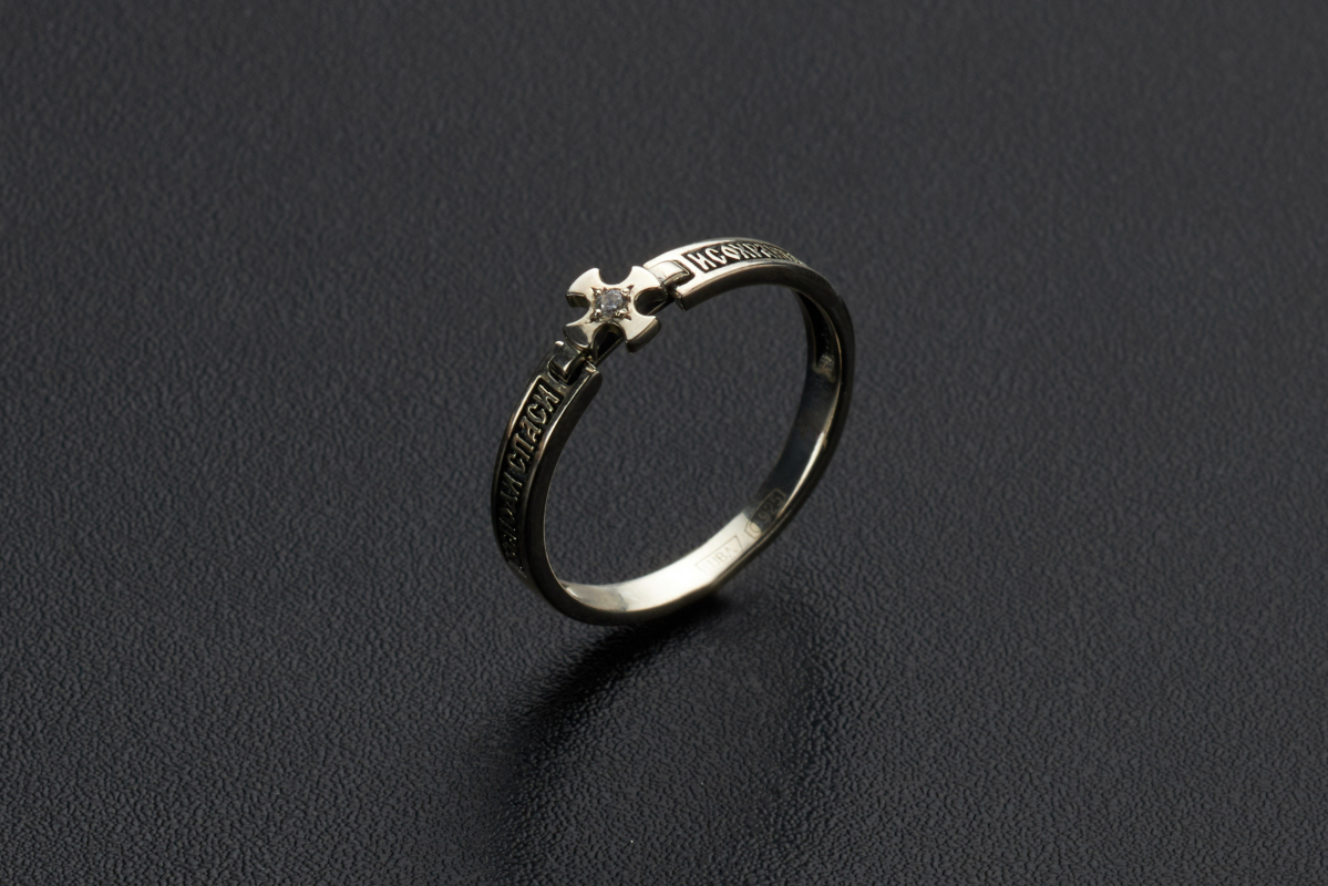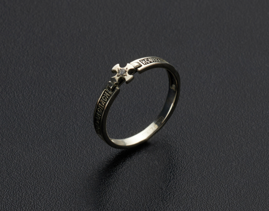 Кольцо выполнено из серебра 925 пробы и украшено фианитом. На поверхности изделия размещена молитва "Господи, спаси и сохрани". Эти слова придают уверенность и надежду в трудную минуту.