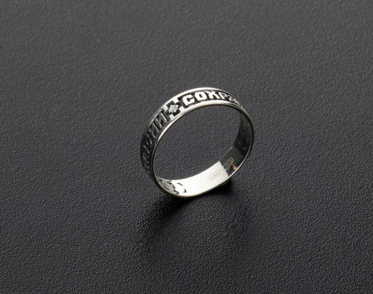 Кольцо из серебра 925 пробы с фианитом. На поверхности находятся слова молитвы "Спаси и Сохрани". Она отражает суть отношений верующих с Создателем.  Ношение кольца, с текстом обращения к Богу о заступничестве, будет напоминать о важности молитвы.