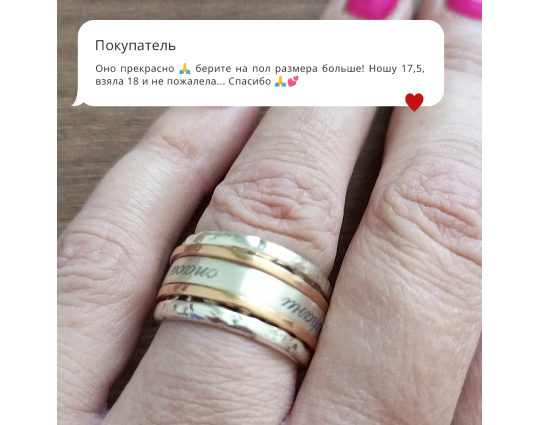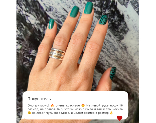 КОЛЬЦО ПРОСТО СУПЕР!!!К СОЖАЛЕНИЮ Я ЕГО ПОТЕРЯЛА ОЧЕНЬ БЫСТРО.НАДО БЫЛО ВСЕ ТАКИ ПОМЕНЬШЕ ВЗЯТЬ ...ОЧЕНЬ ЖАЛЬ,ЗАКАЗАЛА ТАКОЕ ЖЕ ЕЩЕ РАЗ.