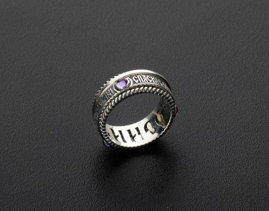 Кольцо выполнено из серебра 925 пробы и украшено аметистами. На поверхности находятся слова "Спаси и Сохрани". В этой молитве заключен основной способ отношений верующих людей с Создателем. Ношение кольца, с текстом обращения к Богу о заступничестве, будет напоминать о важности молитвы.