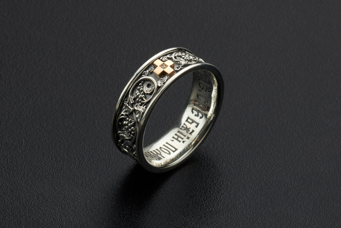 Православное кольцо из серебра украшено узором в виде виноградной лозы. Это один из самых известных символов христианства. Крестик на кольце покрыт позолотой и украшен бриллиантом.