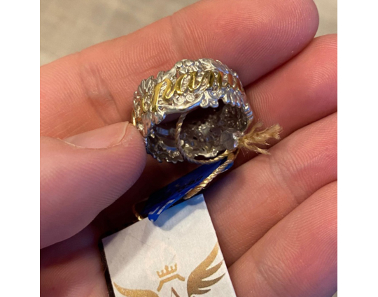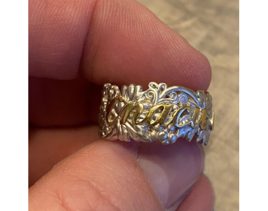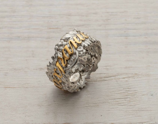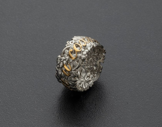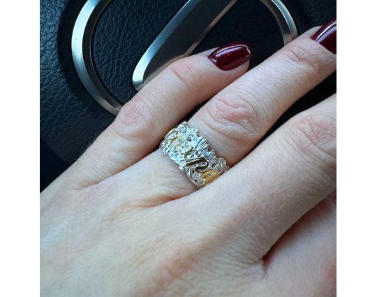 На поверхность кольца нанесены слова "Спаси и Сохрани". Их значимость и важность подчеркивается выделением с помощью позолоты.