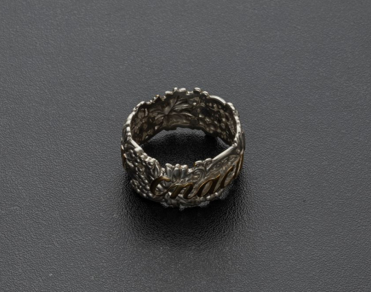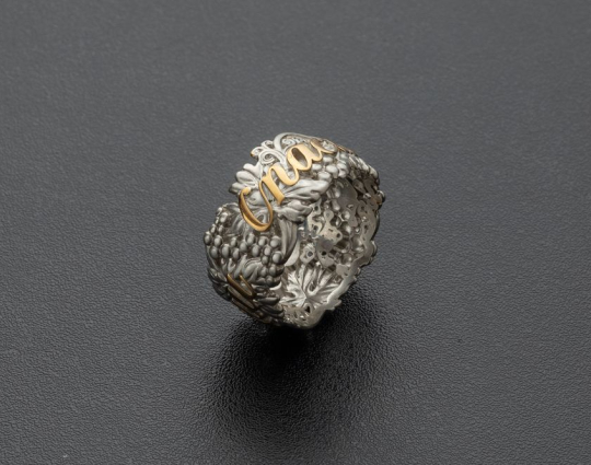 Кольцо выполнено из серебра 925 пробы в виде виноградной лозы с листьями и ягодами. Это символ начала новой жизни и единения, связи и общности всех  христиан, объединенных одной верой. Виноградная лоза символизирует так же Иисуса Христа.
